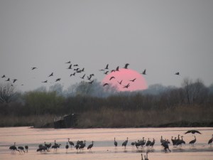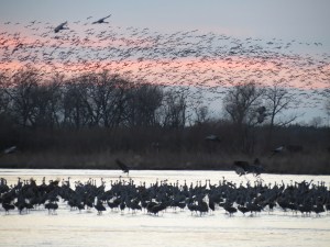 Photography is a big issue and at times a problem. All flashes must be turned off and even taped, if there is any question. The automatic focuser must be taped, so no light can show. This does not affect the photography. I ask for automatic rapid fire photography to be shut off, and only manual shutters to be used. I have had photographers brag about 8 GB of photos taken, and one person told me that he had taken 3000 pictures during one blind session, averaging 40 a minute. I have to wonder how many of these pictures are ever looked at over and over again, and how many pictures one needs of a Sandhill Crane, if that individual is an amateur. I find the sunsets striking, and the great flocks of birds flying at sunset are wonderful to see.