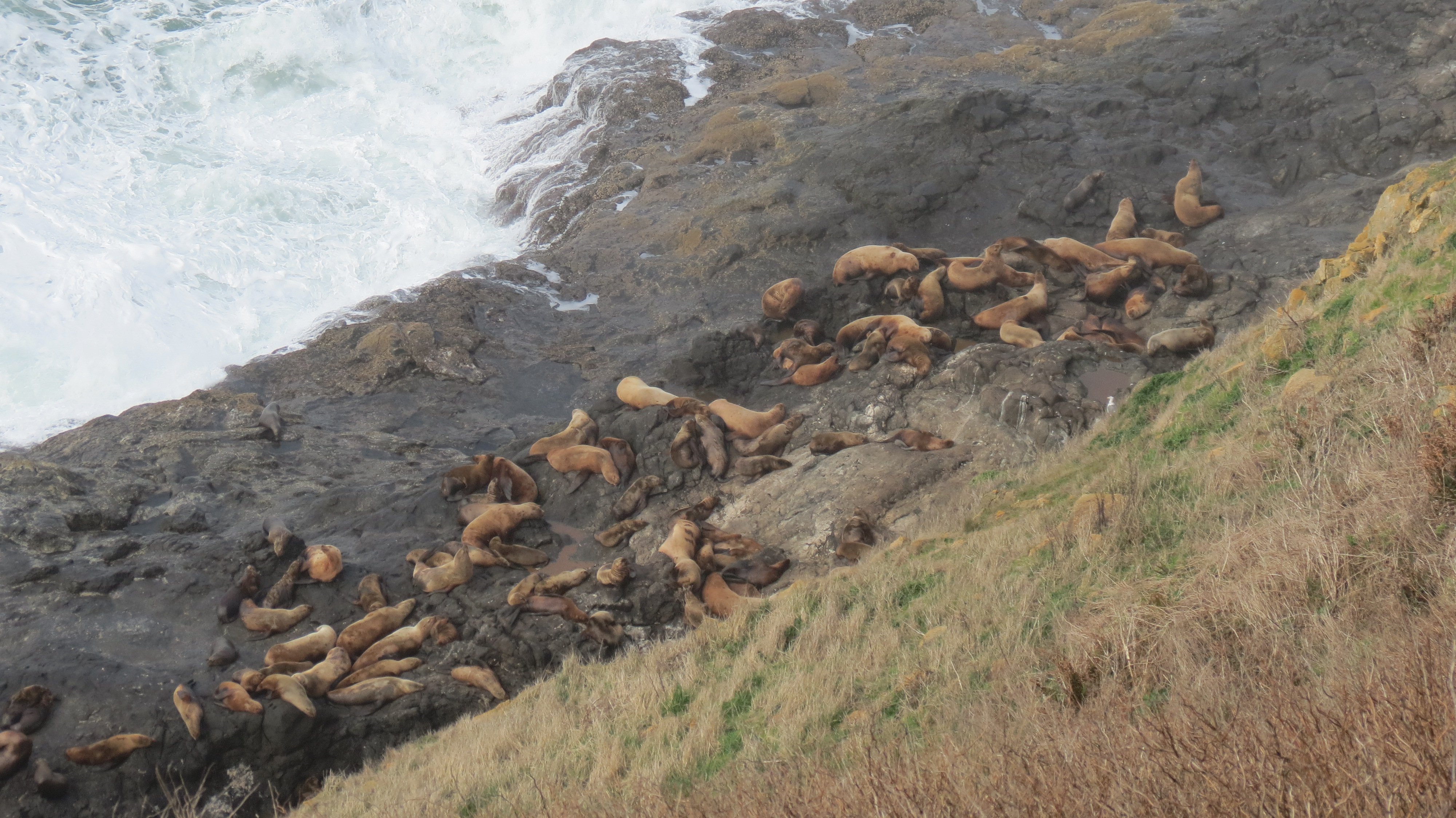Were the Caves to be developed today, there would be too many restrictions placed on the owners, and the business would either be abandoned, or else the admission price, $12 for adults, would be much higher. In order to have a more high tech building, permits would be required from 25 to 30 government agencies, as well as strong restrictions upon sewage disposal, which exist along the coast. The owners have dealt with these issues successfully, and their goal is to keep the caves for the Sea Lions and not change what is currently working. There is a lovely walkway to an overlook of dozens of Sea Lions, followed by another walkway to an elevator that takes people down 60 meters to a large cavern, where the Sea Lions can be seen at ocean level, and where there are many exhibits giving information about these large creatures.