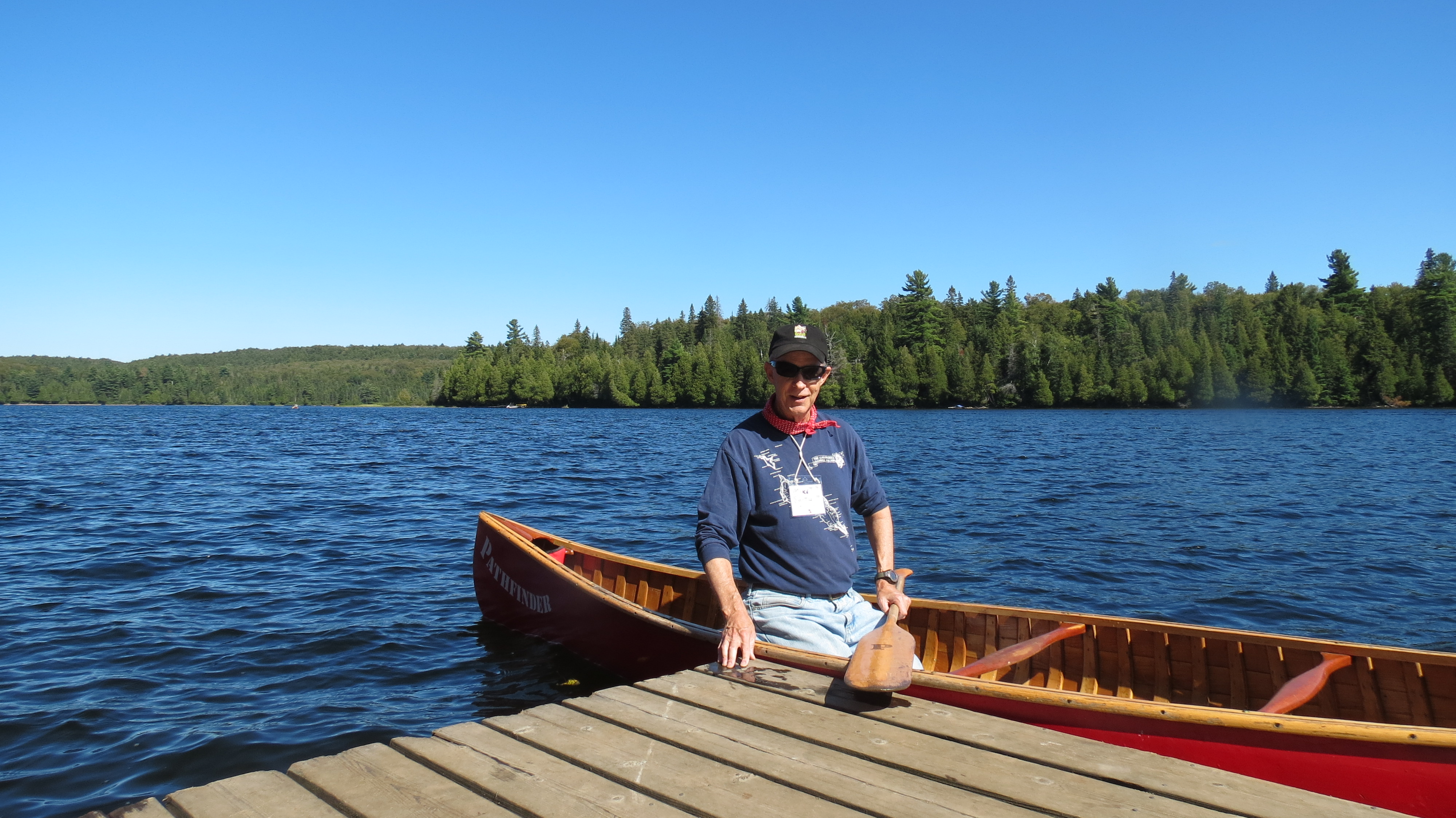 Back from a paddle around the island….and of course a little more. These red canoes are hand made, still wood and canvas, and weigh about 41 kg (90 lb). On the day trip, I carried it 1400 meters without stopping. To still be able to do that was one of the high points of the trip. My shoulders hurt for several days after. Notice the red neckerchief. That is the sign of a head man. I earned that, and I was not the only one at the reunion who wore one.