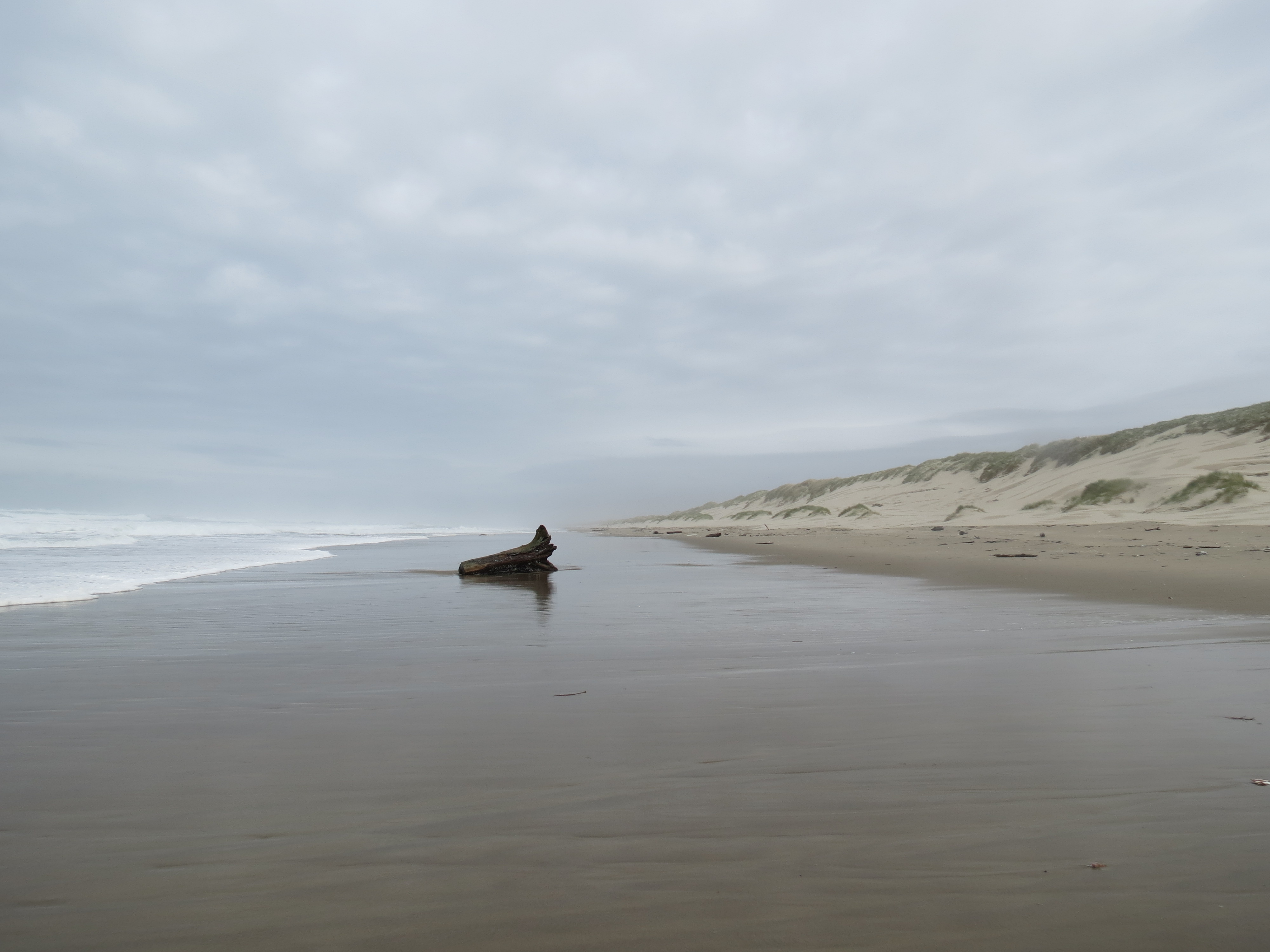 I continued further south along the beach, climbing into the dunes, taking pictures of the ocean, the dark clouds that would herald rain later, and returned to where I came into the beach. I constantly monitor the sky, I am less good about monitoring the ocean. I saw a large log, 18 inches in diameter and several feet long, with perhaps a foot wide flat surface on top. I stood on the log, timed the swells, curious as how often a big wave would come in. Nearly all waves crested about 50 yards away.