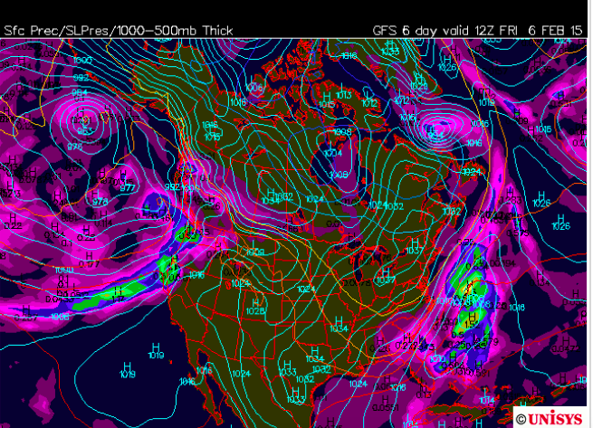 Below: GFS Model showing precipitation (purple), heavier (blue and green) along with the 1000-500 mb thickness (one measurement of high and low pressure). This is 6 days out, at 12 Z 6 February, or 4 a.m. Friday. It shows that the Pacific Northwest is going to be wet, and northern California may get a strong shot of rain. Notice the rain in the southeast and off the east coast. The GFS has a panel of 10 days, with 1/2 day intervals. The GFS has been showing this for several days, but the focus of the heavy rain has not been consistent.