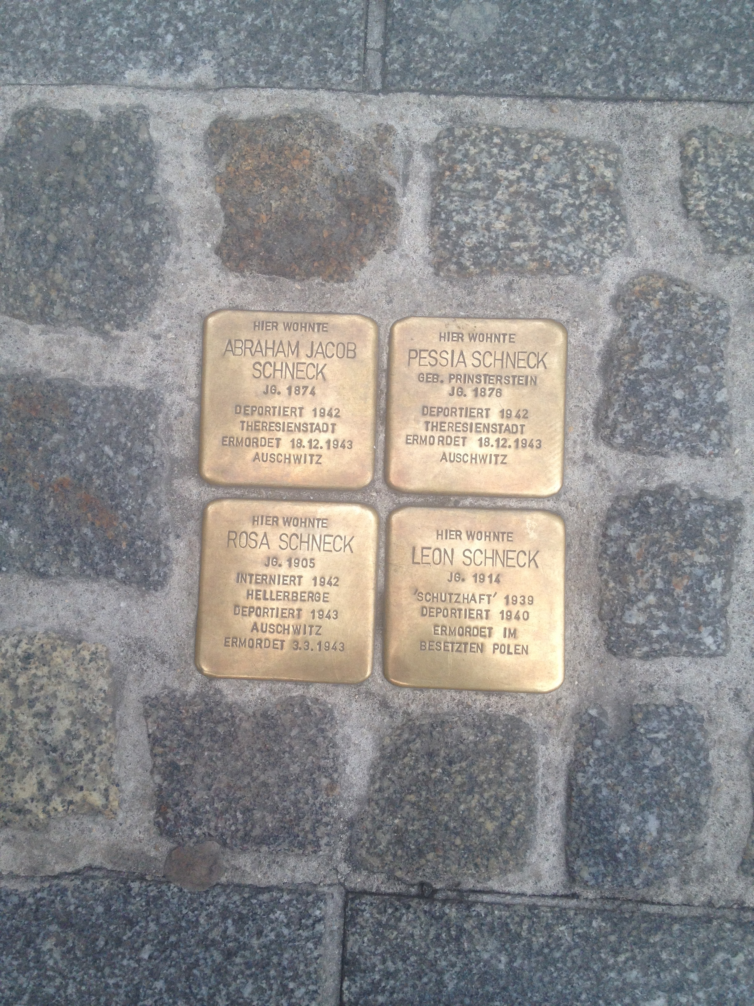Notice the word “murdered.” The German Resistance, Holocaust, and Jewish Museums use the word “ermordert,” rather than “gassed,” “shot,” “starved to death,” “jumped off a cliff without a parachute,” or “died from tuberculosis/typhus.” They don’t mince words. Those who died were murdered. They were forcibly deported, after losing their livelihood, their possessions, their families, their health, and finally their lives. Walk the streets of Berlin or Dresden, and occasionally you see a “Stolperstein,” a small sidewalk marker, where somebody or several somebodies once lived. These people were deported to a concentration camp and then murdered a year, two years later. Don’t believe me? Here are four. Two were my age.