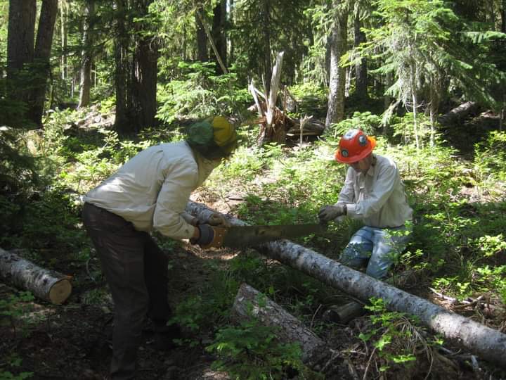 Author (right) sawing a large Douglas fir. The orange wedge keeps the kerf open. I carry two in my pocket, which Ian, the other person, adopted. It saves time having to find one in a pack when one knows a log will need it. One of my modifications to the work gear. Diamond Peak Tie Trail, Diamond Peak Wilderness.