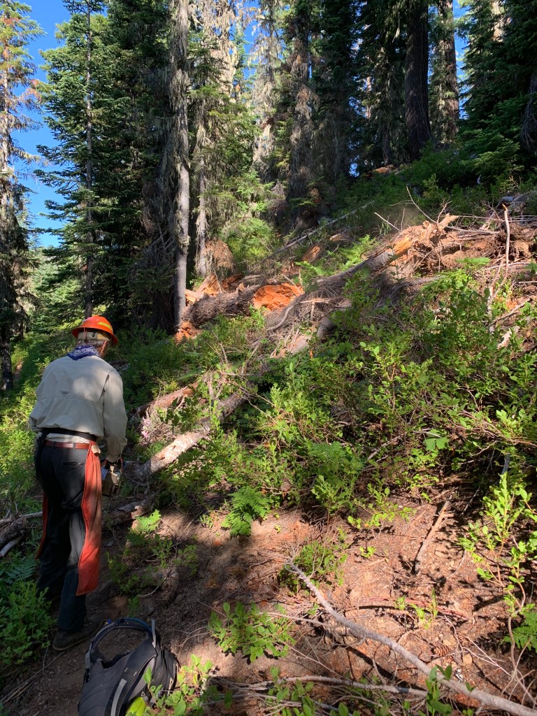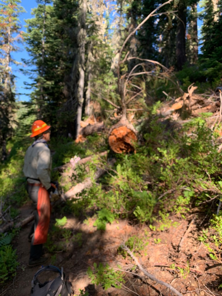 A short while and two cuts later, we stashed the chain saw and entered the wilderness, dealing with two moderate size blowdowns (16 inches, 40 cm in diameter) using 2-man, 5-foot crosscuts. There were a modest number of blowdowns needing to be cut before we reached the junction of the trail to Divide Lake and the Pacific Crest Trail, and headed towards Divide Lake. Here, we had to cut out several large downed trees. We did some leapfrogging, where two would work on one blowdown and the other two worked their way up the trail. By the end of the morning, we had cleared the lower half of the trail.