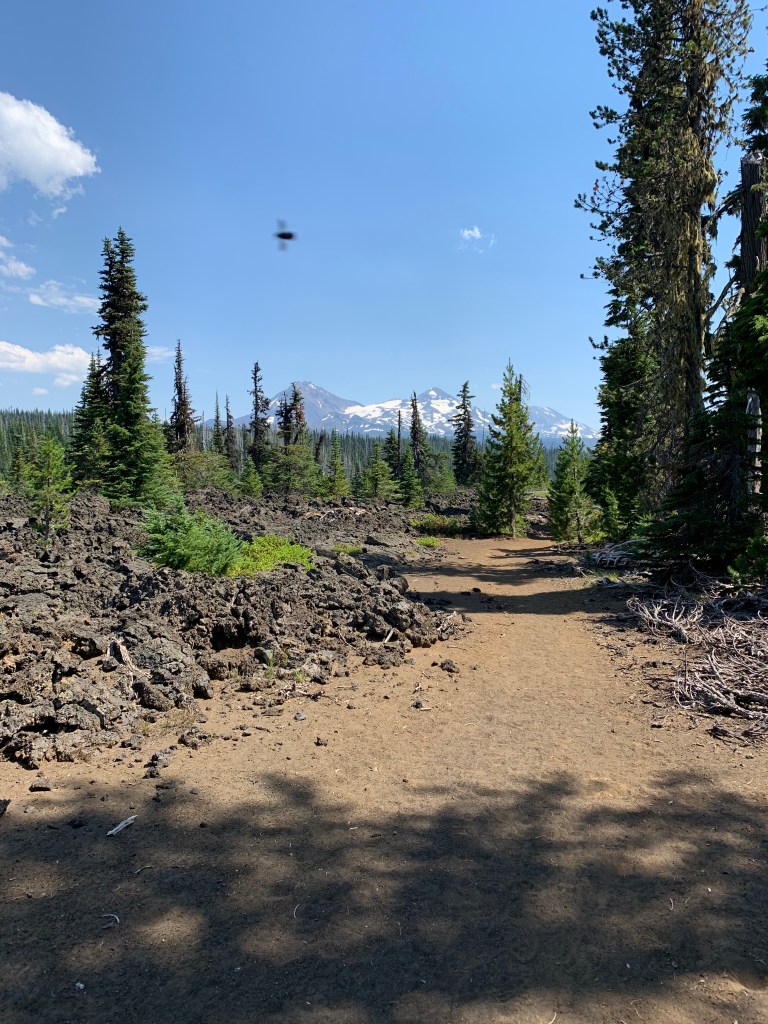 Hiking out the Hand Trail (Mt. Washington Wilderness), on the first of what would be three days clearing the 4 mile (6.5 km) trail. Three Sisters in the distance, volcanic rock from past eruptions on the left.