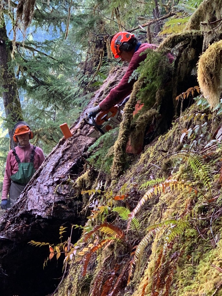 We had hiked in 2 miles that morning, with packs, heavy tools, including chain saws, up some nasty uphill sections, worked another 2 miles cutting out logs, cleaning up debris, and then returned the same way, up where we had gone down, down where we had gone up, the last part a barely marked trail steep uphill and eventually to the cars. As usual, the trail had more ups than downs.