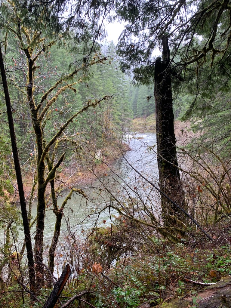 By the time I had finished driving back down the long downhill grade, getting out of the car twice to throw some large rocks off the road, and a third time to cut off another a branch that was impeding traffic, I was warm and drove across the bridge over the roaring North Fork on the gentle downhill into Westfir.