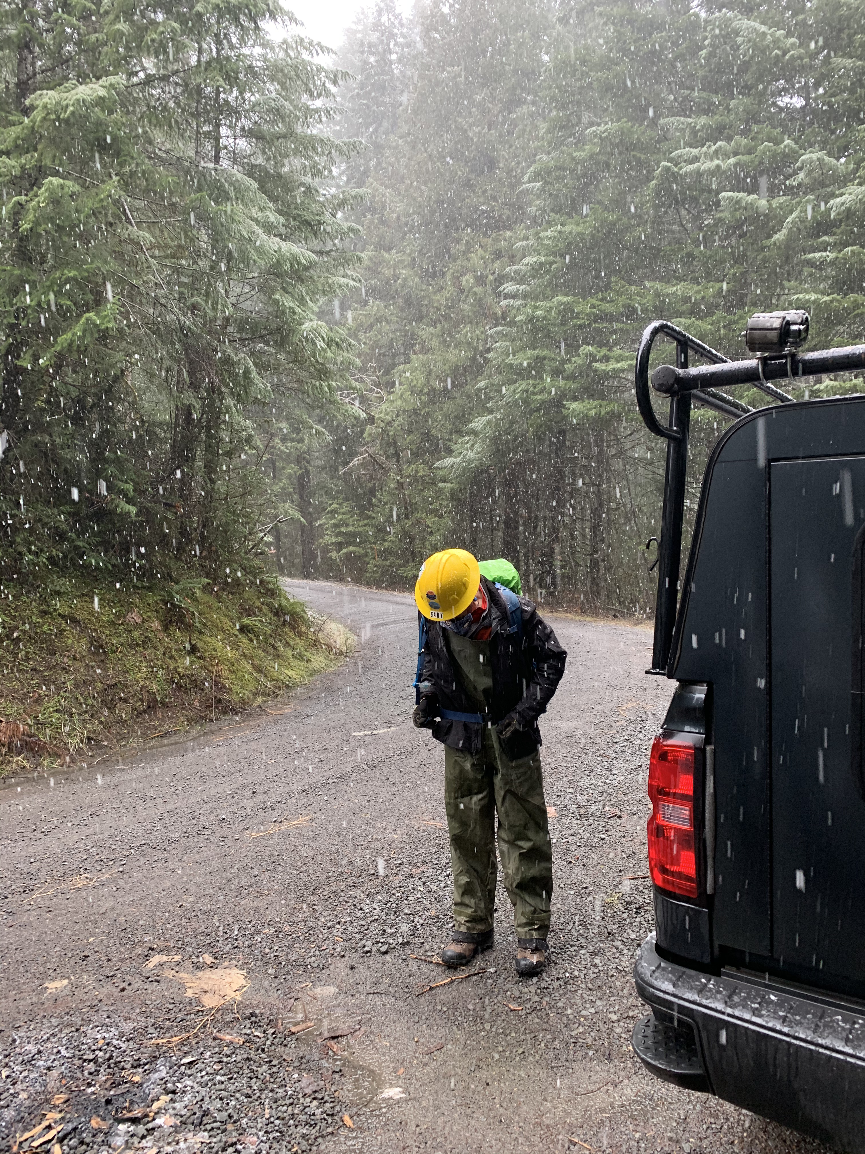 I guess it was raining while we worked. It was hard to notice, with the chain saw working, my pulling 100 pound planks up the hill and stacking them, grinding off the spikes with a grinder, sparks flying a foot or two in front of me. But when I looked, my rain jacket and pants were soaked. Sometimes out there, I look down, and water pours off the hardhat, my first realization it is raining. We stayed warm while we worked, took the bridge down by noon and in the rain hiked back out to the vehicles, up the tough, muddy, steep hill. We packed out all the tools, and after everybody left, I had lunch up there, rain pouring on the car roof. No more snow. I ate quickly, because I was rapidly cooling off, which on cold days is actually the most difficult part, because one is cooling off rapidly and becoming uncomfortable, even while one is resting. I then started the car, set the heat on high, and when I reached the main road, the Crew Leader was waiting for me, making sure I was OK. I apologized for not telling him I was eating. Nice to know someone would look for me if anything happened. By that time, the heater was going full blast. I may not have noted the wetness while working, but I sure did notice it then.
