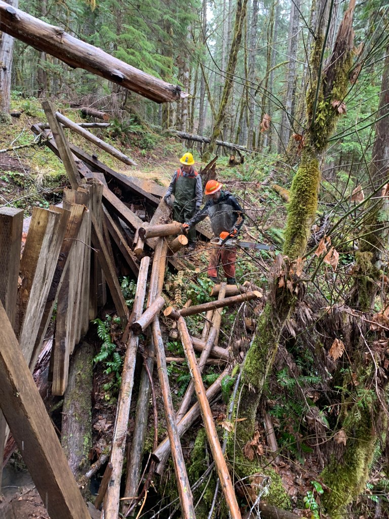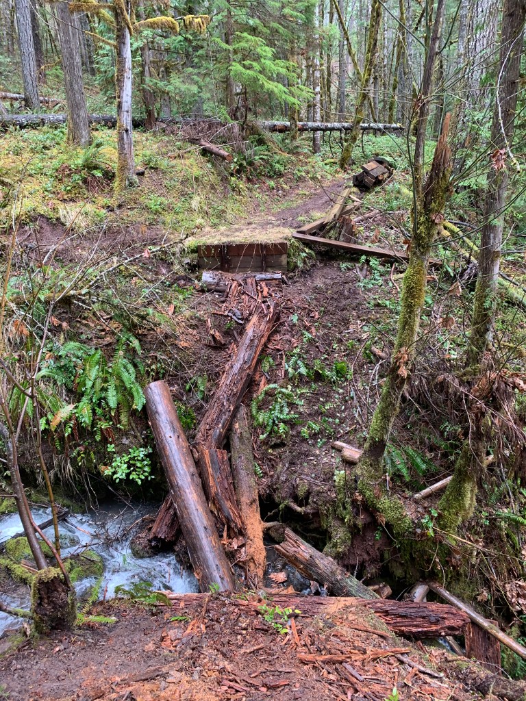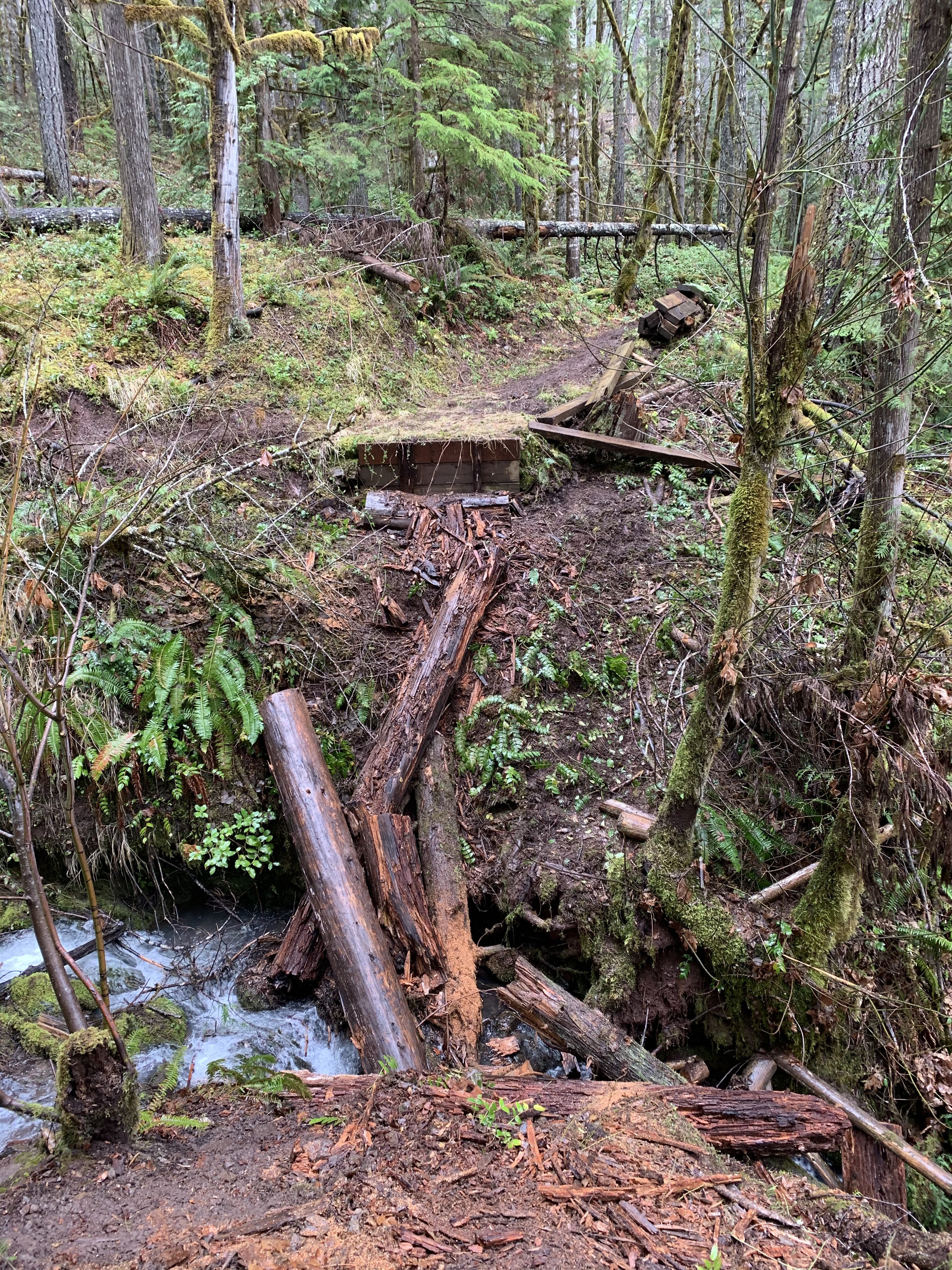 The Crew goes out rain or shine. We had a run of favorable weather until this past week, until our job was to take apart another failed bridge. I picked up a Pulaski and started down the steep muddy user trail we had made, knowing that precipitation would soon change to rain as I descended. It did, and the faint trail changed to mud as I discovered when I slid down the last 10 feet to the main trail below. We immediately crossed one passable but damaged bridge, hiked past a creek where we had removed the first failed bridge and continued a half-mile to the next bridge.