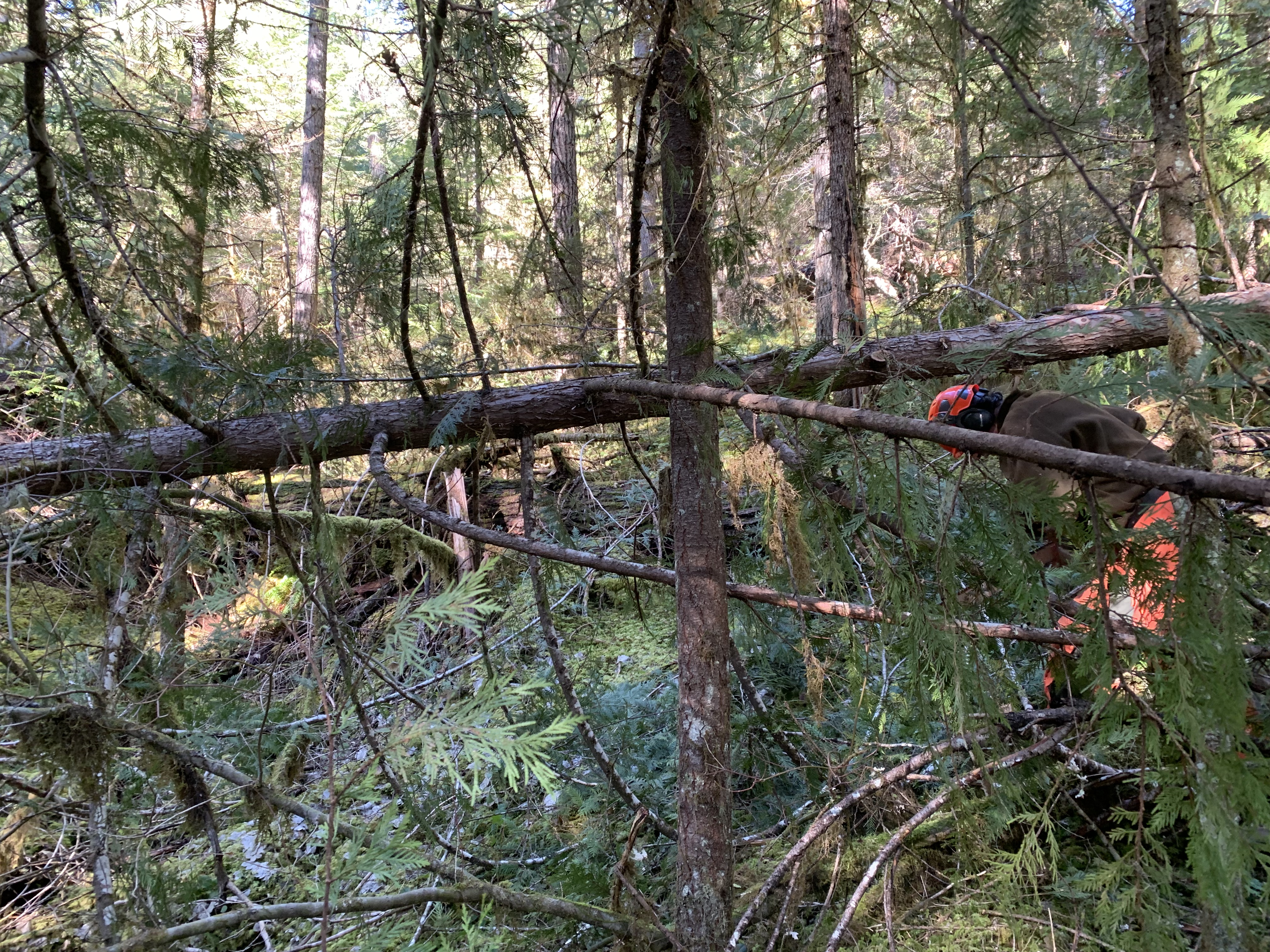 I hadn’t seen tree felling in thirty years, back when I spent a season as a wilderness canoe ranger in the Boundary Waters, and we used crosscut saws to fell trees that were potential dangers to campsites. I remembered to look up at the branches of the tree we were going to fell to see where most of the weight was, so we could predict where it would fall. Fortunately, many of the Crew had backgrounds with the Park Service, Forest Service, or BLM (Bureau of Land Management), and they were certified fellers. One of us put pink ribbon on cedars we were to cut, we had one sawyer, and I was the swamper, working with the cutter and doing the limbing. Cutting is a lot different from bucking on the ground. Tree falls, limbing, or removing the limbs is necessary, and instead of pushing logs off the trail, we brought logs to the trail, in order to carry them to the bridge.