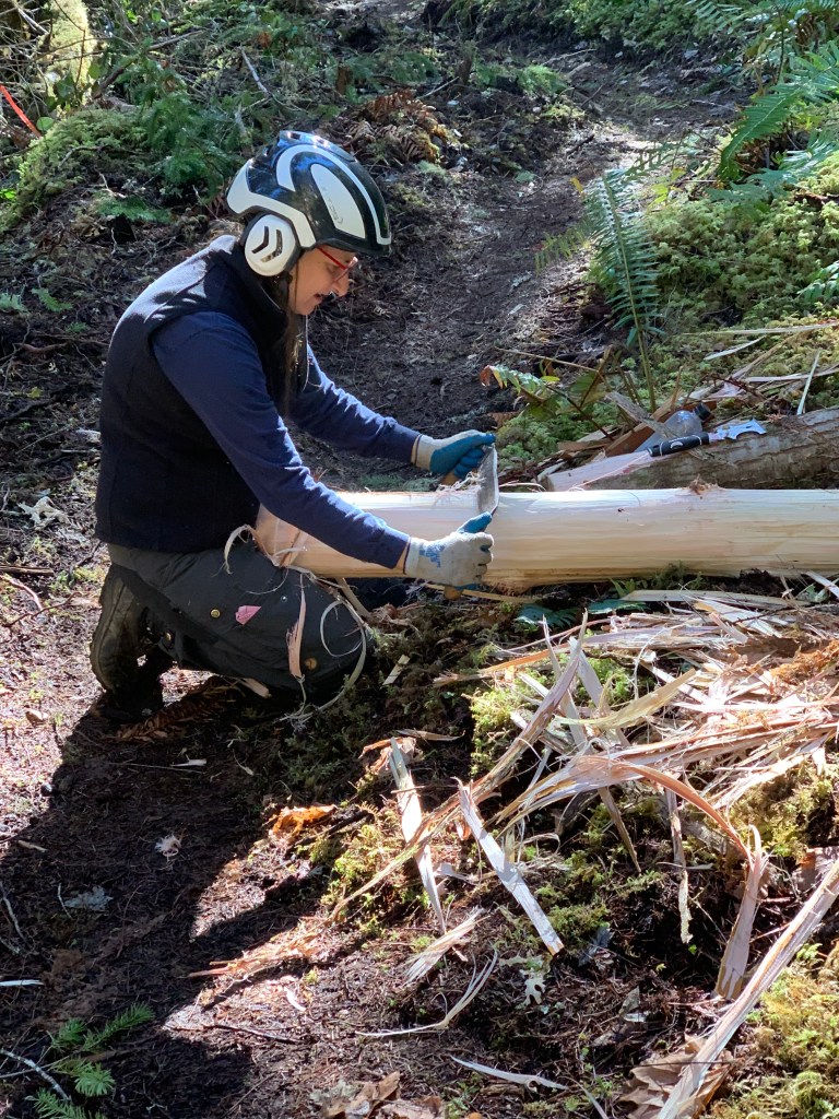 We split into two groups, one to work on the trail tread, the other to search for hopefully nearby cedar, where we could strip and carry them a short distance. Red Cedar is not heavy, about 27 lb per cubic foot dry, a lot more wet, which these were. We had to fell the trees, take the limbs off them, then it was possible to move the definitely heavy log from the woods to the trail, where we made precise measurements, cutting the logs into four foot lengths for posts. Then it was time to start de-barking.