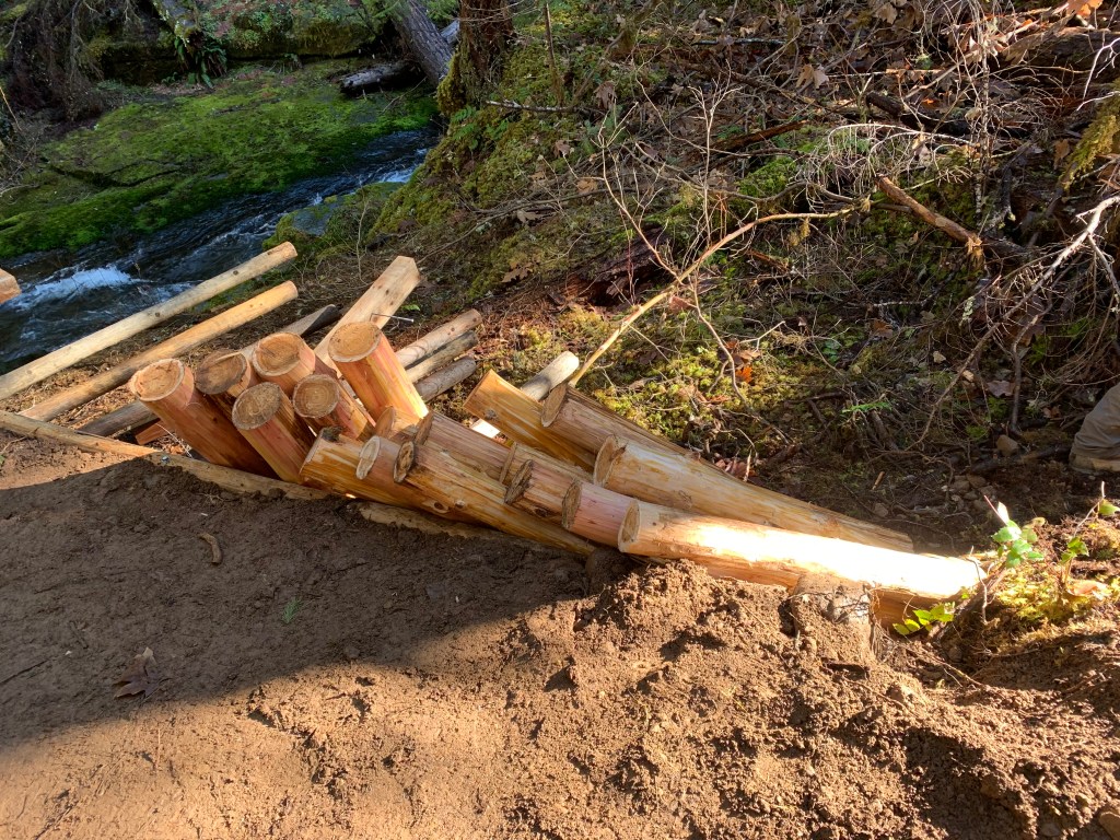 We had had an interesting morning on the Middle Fork Trail of the Willamette River, beginning the job of building a railing for the new bridge over Indian Creek, a free flowing tributary of the Middle Fork. We found our own materials, Red cedar, in the nearby woods, stripped the bark off it and then took the bare logs to the bridge area to eventually place as one of the smaller posts or a larger railing.