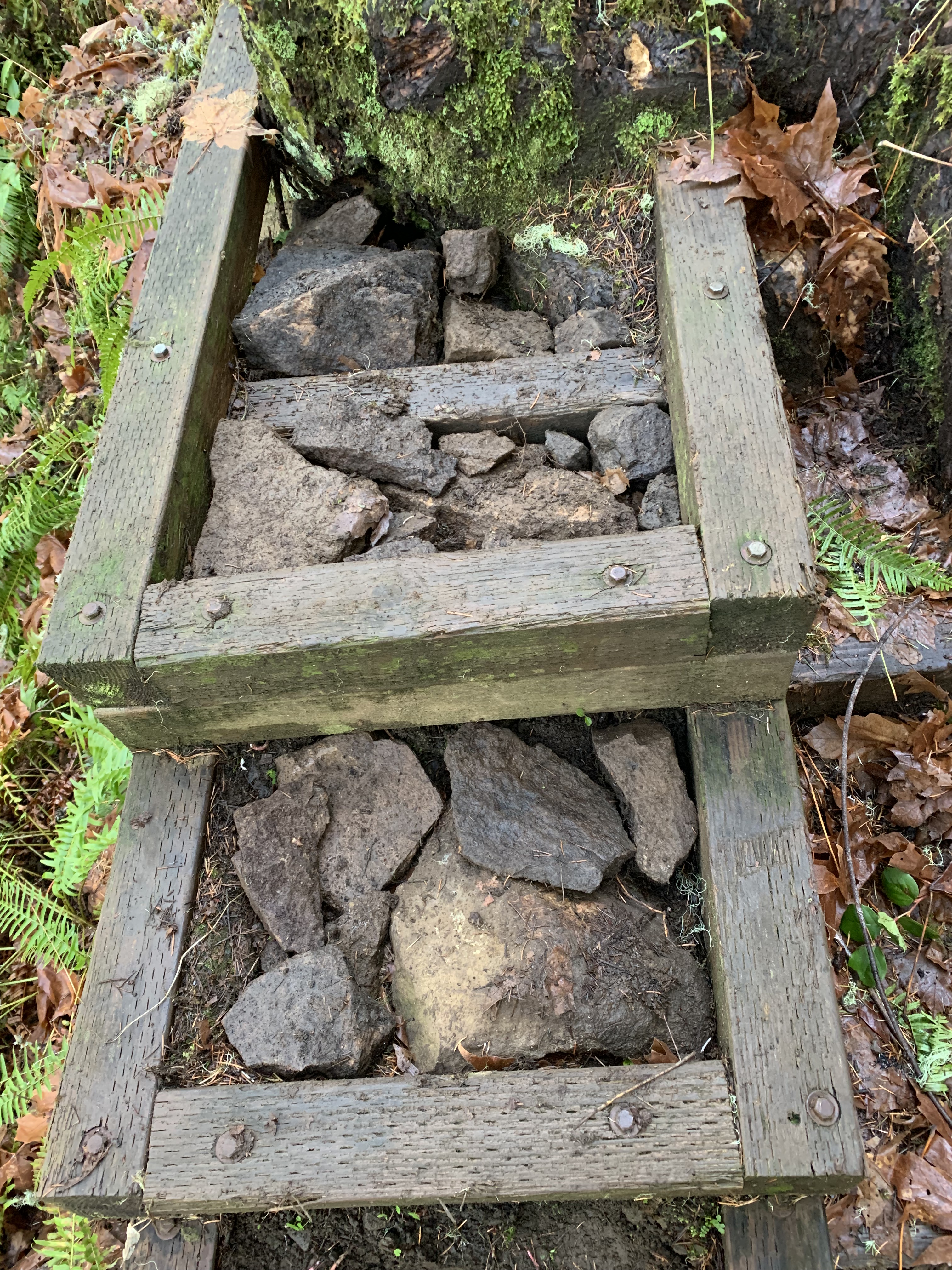 In April, I led a four member crew to the ridge from the reservoir side and we power brushed the mile stretch that formed part of the E2C—Eugene to Pacific Crest Trail. Two weeks later, I led a hike with the Club to show what 13 visits to a trail (12 of those visits I was on) can do. Hikers occasionally need to see what kind of work goes into a trail, for falling trees and encroaching brush don’t disappear without some work by someone. Four days later and 20 degrees cooler, much wetter, five of us drove up the road, around the bushes that pushed out over the grade, through large puddles, now able to avoid cut stumps that once almost took out one of my headlights, in order to tackle the root wad hole and make the trail safer. We worked in rain and mud, using cut logs or rounds to support a series of three retaining logs, one we found that used to line the trail but was no longer relevant there; the other two came from a nearby tree. We filled in the holes with rock that we found 100 yards or more away and had to be towed with a rope to the work area, lowered down a hill in a bucket, or hand carried near the trail and passed off to another. The trail looks great now. We still have work to do, but it is now safe to hike, in a pretty woods, especially higher up, and doesn’t get a lot of use.