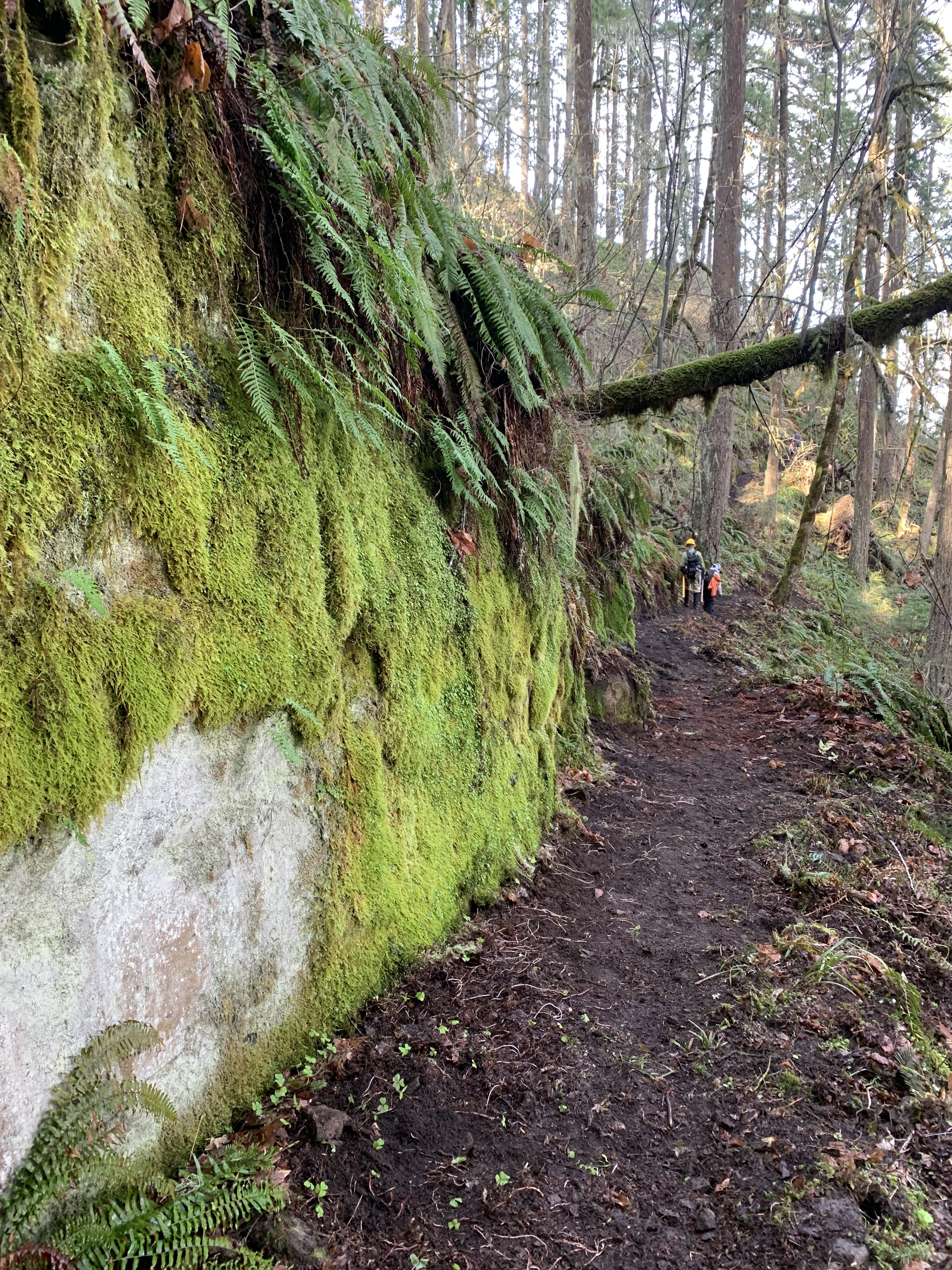I love the rock wall near the top of the trail, a place that stays cool in summer, has a covering of almost turquoise moss in places, and where the trail is by necessity narrow with a drop off into a small ravine.