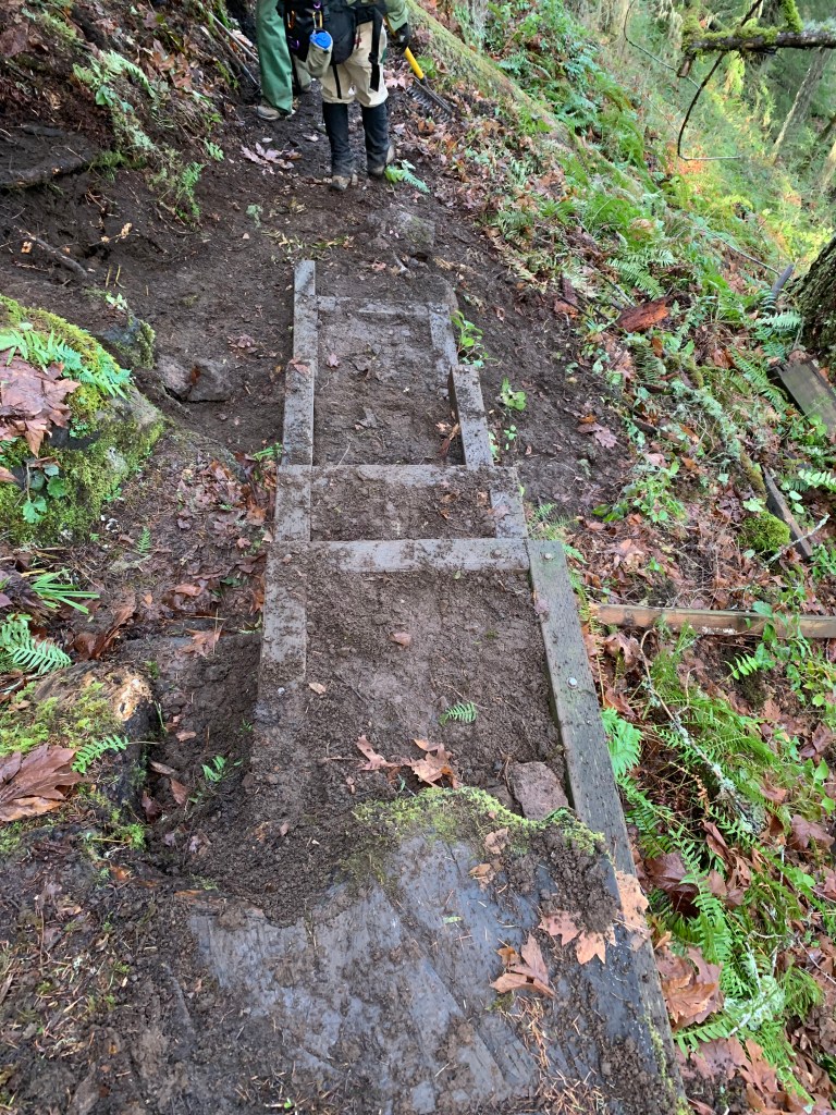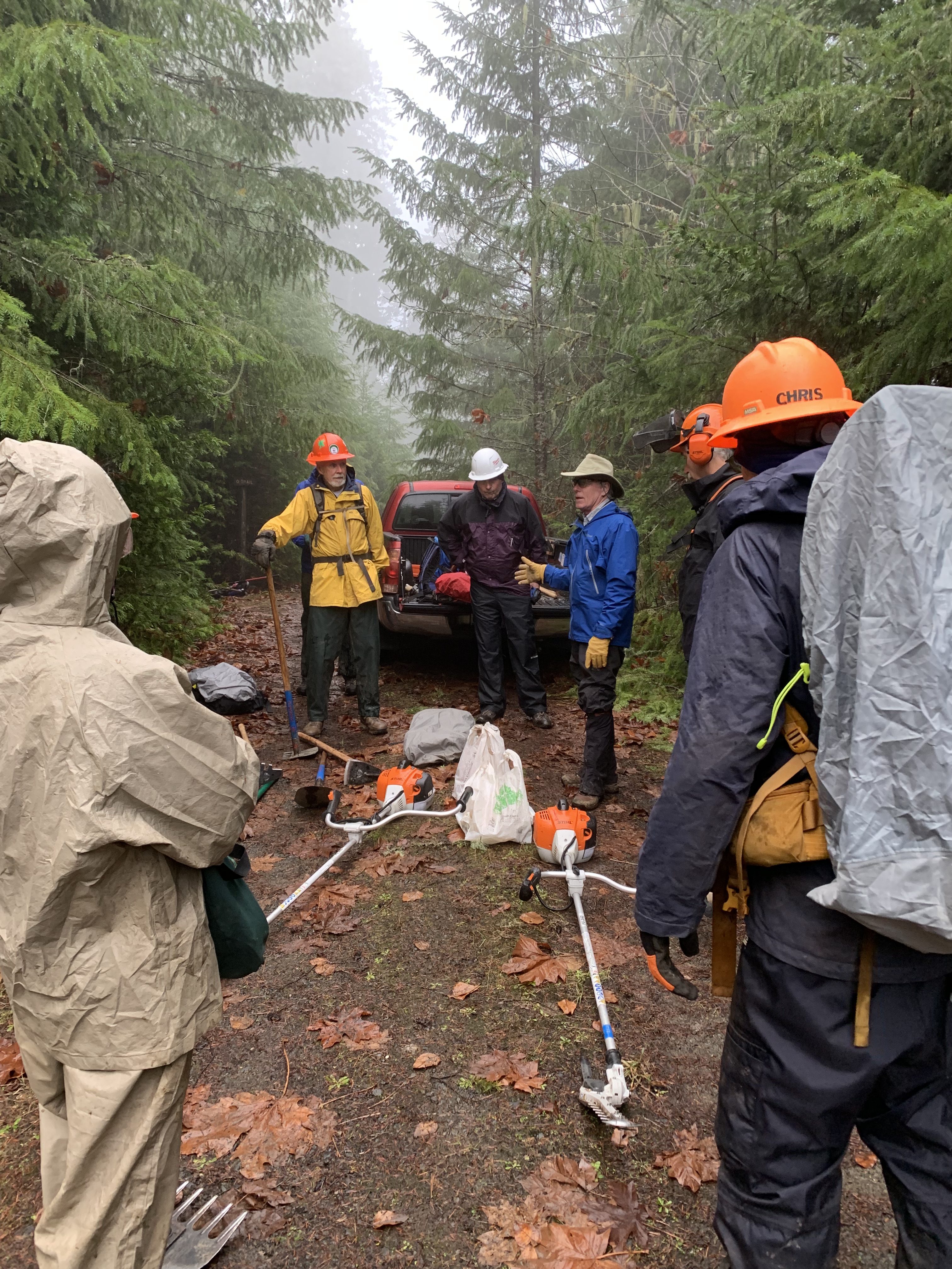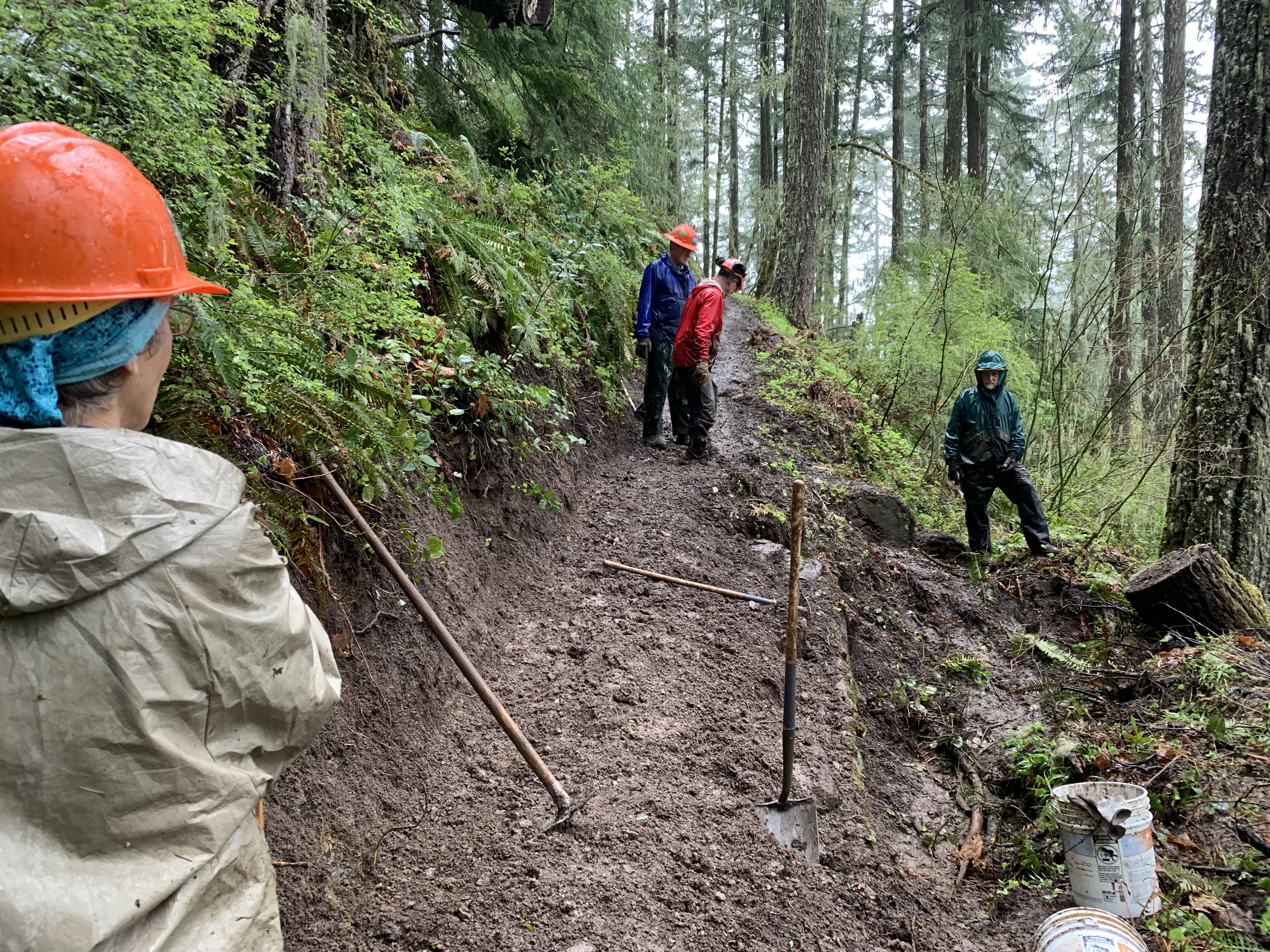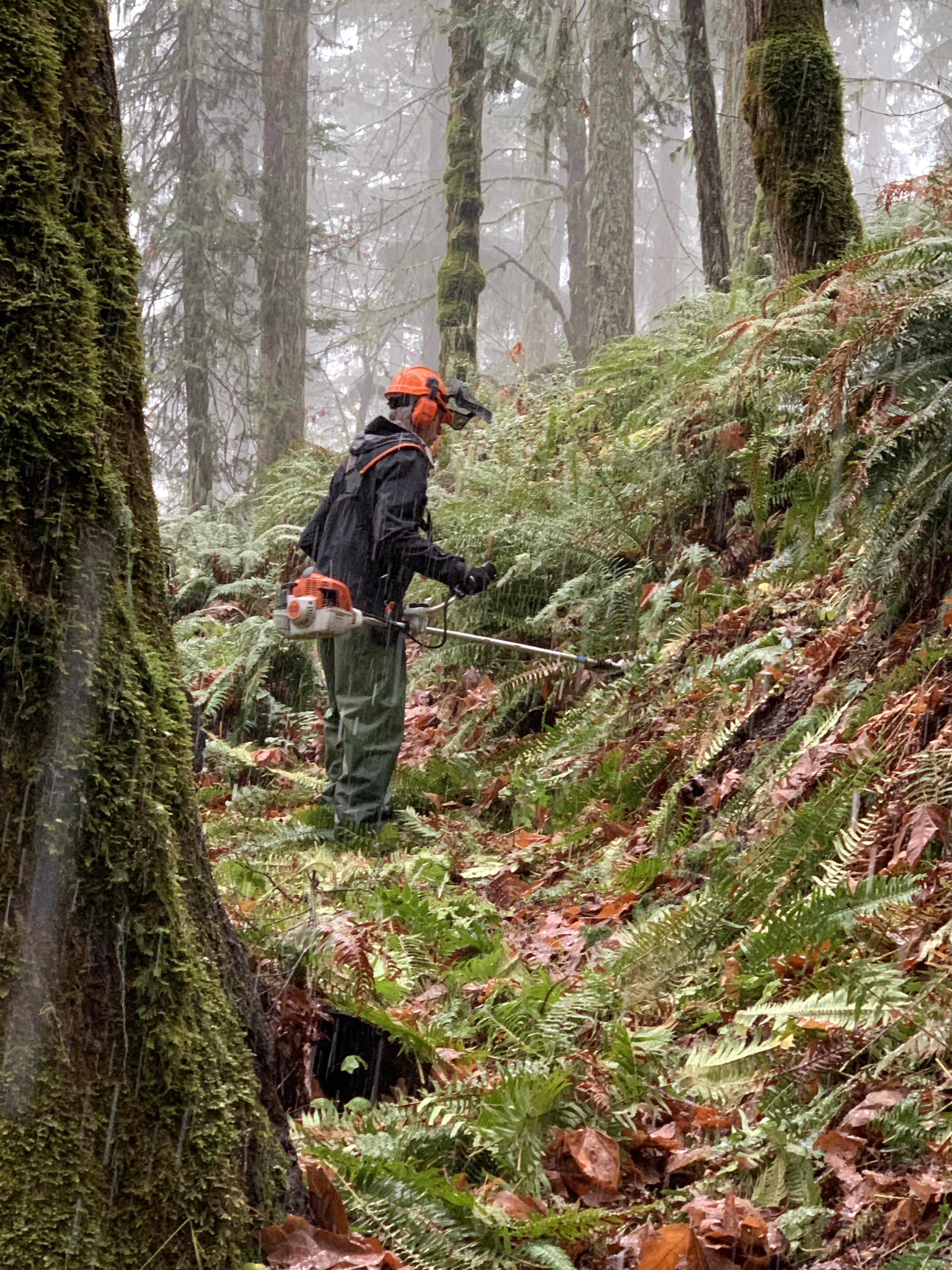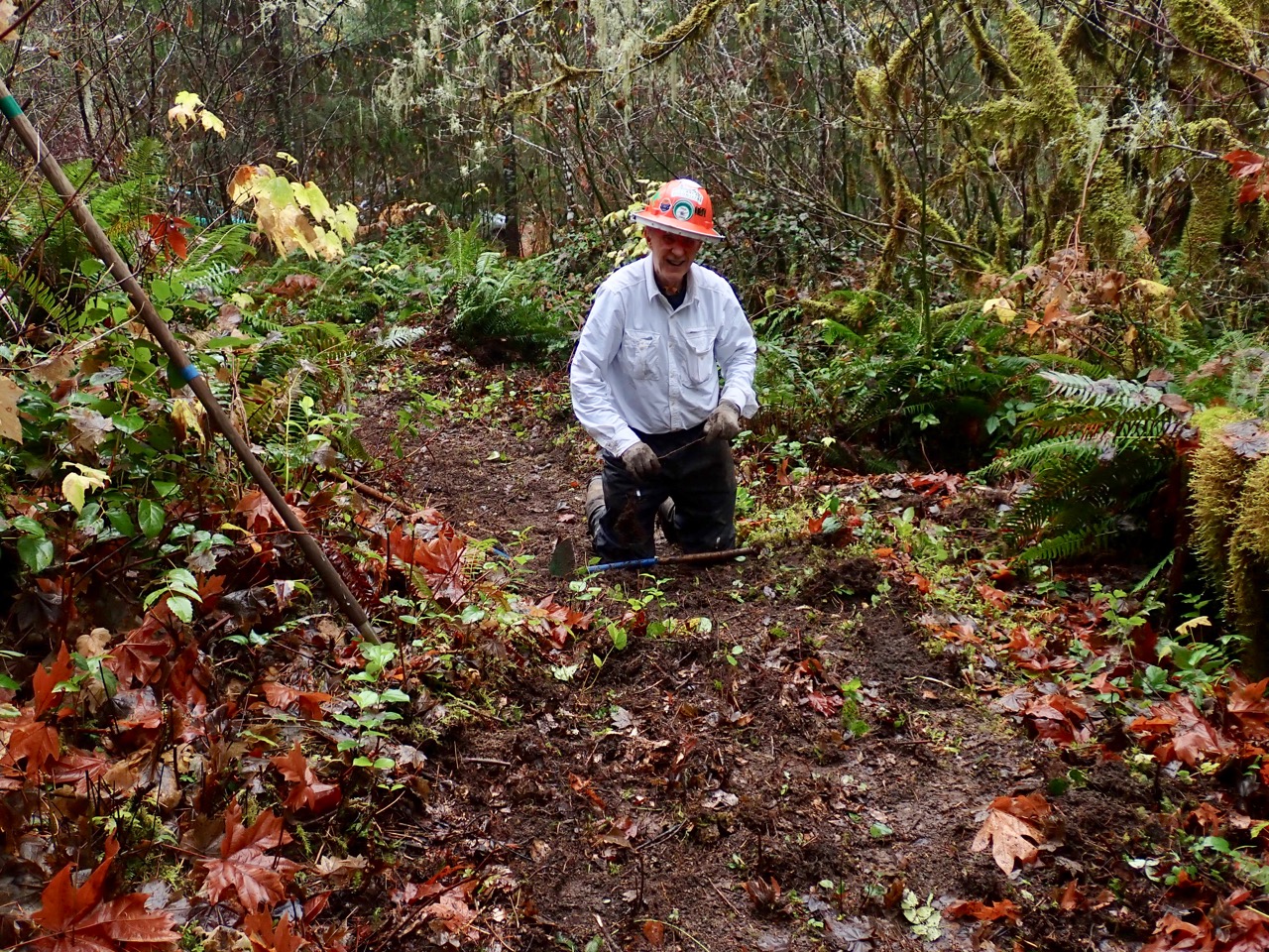 By December, we were ready to tackle the top part of the trail, 1.2 miles, climbing several hundred vertical feet to a ridge between the Winberry and the Lookout Point reservoir drainages. We had logged it out; we now needed to power brush the whole trail and then do tread work on all six thousand feet of it. We worked in a snow drizzle using multiple pairs of gloves each day, digging, getting on our knees to pull out Salal and some Oregon grape, and we worked the tread more than a yard wide as we moved up the ridge. I was one of two who power brushed the whole trail. After we finished, we then continued to improve the tread, refurbish some steps that were abandoned in 2007, leaving only at a root wad hole and a spot where the trail needed to be rerouted to be future work. I learned on Wiinberry how important good rain gear is for trail work.