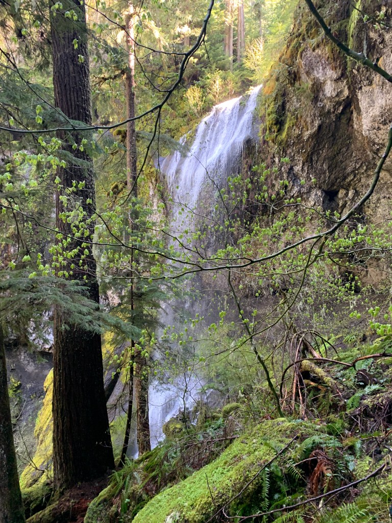 I was looking for a hike that I hadn’t done, interesting, and not too strenuous. A friend told me last year about Pool Creek Falls up FS23 out of Oakridge towards Vivian Lake, 19 miles uphill. We actually were driving by the trailhead at the time, but I couldn’t see anything. Turns out that at about mile 13, there is a small grassy pullout, and if one looks carefully, there is a trail. I had been by this a dozen times or more, usually dodging a big depression in the pavement there—AKA “sunken grade.”