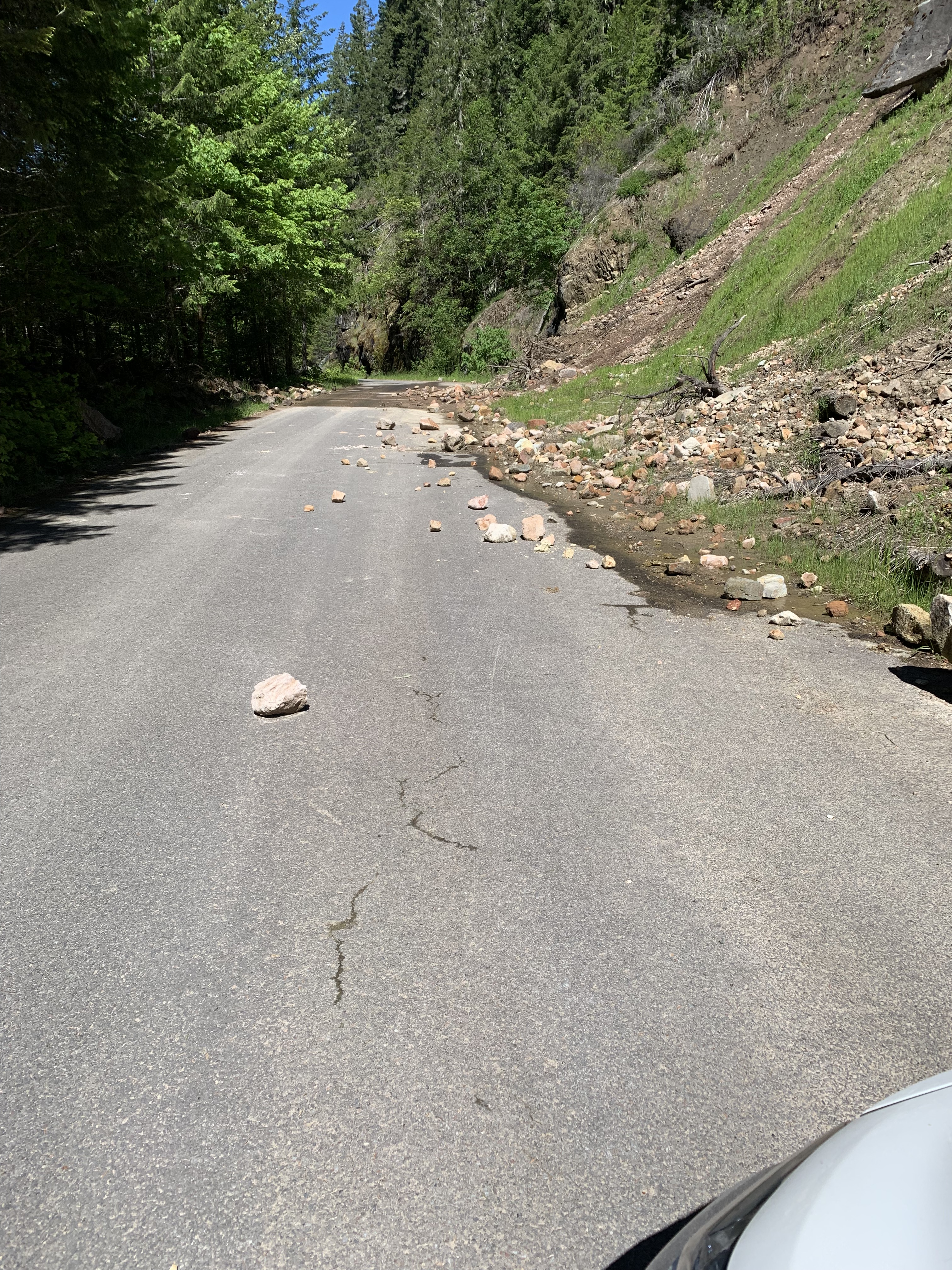 On my way back down 23, I again saw a small tree across the the road. I had driven over it on the way up, but I don’t like doing that and had time, a saw, and ability to take care of the problem. So I did. There are several roads into trail heads in spring where there are blowdowns. The Forest Service cuts them out, sometimes with scanty clearance. It’s amazing what people will do on a road to avoid hitting a blowdown or getting out of the vehicle to deal with it. I plead guilty. The drive to Horse Creek Trailhead is a veritable zig zag from one side to the other. On the way in, we want to get started on the trail and don’t want to stop to clear the road. We’ll get it on the way out, except when we drive out, we are all so tired, we don’t. And so nothing changes. The rocks that had fallen on FS23 needed to be removed as well. One can dodge these rocks, but on a trip to a work site along Hills Creek Reservoir a few weeks earlier, the driver thought his pickup would clear such a rock. A moderately loud scraping noise—the kind that makes you immediately think “oil pan”— told us we hadn’t. Fortunately, there was no damage, and on the way back I got out and removed the offending rock along with a few others. Remembering that day, I decided to clear rocks on this road as well. It was a nice day to work.