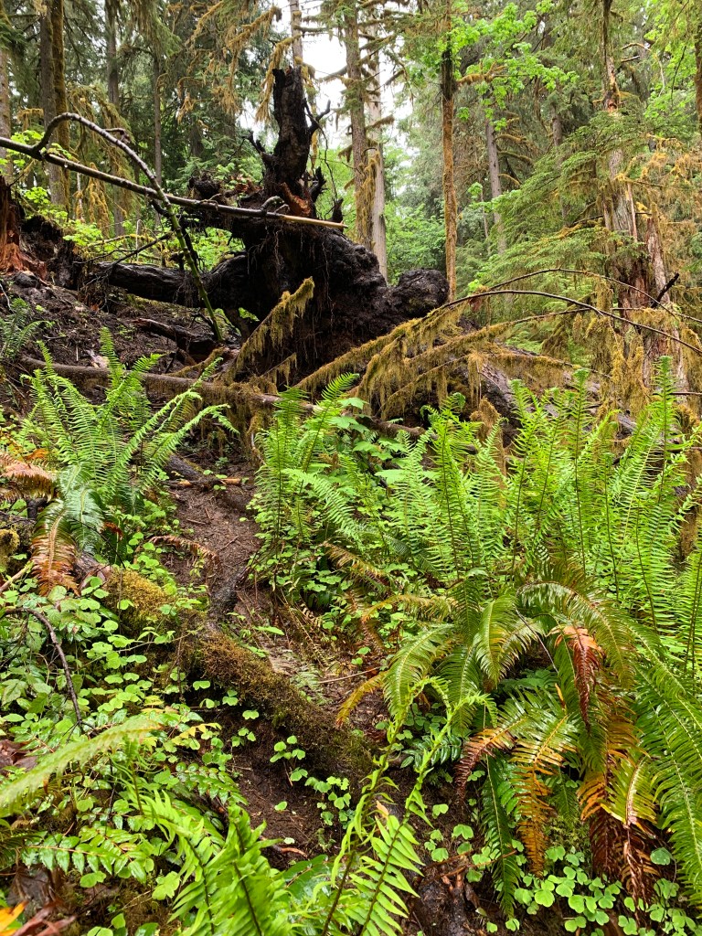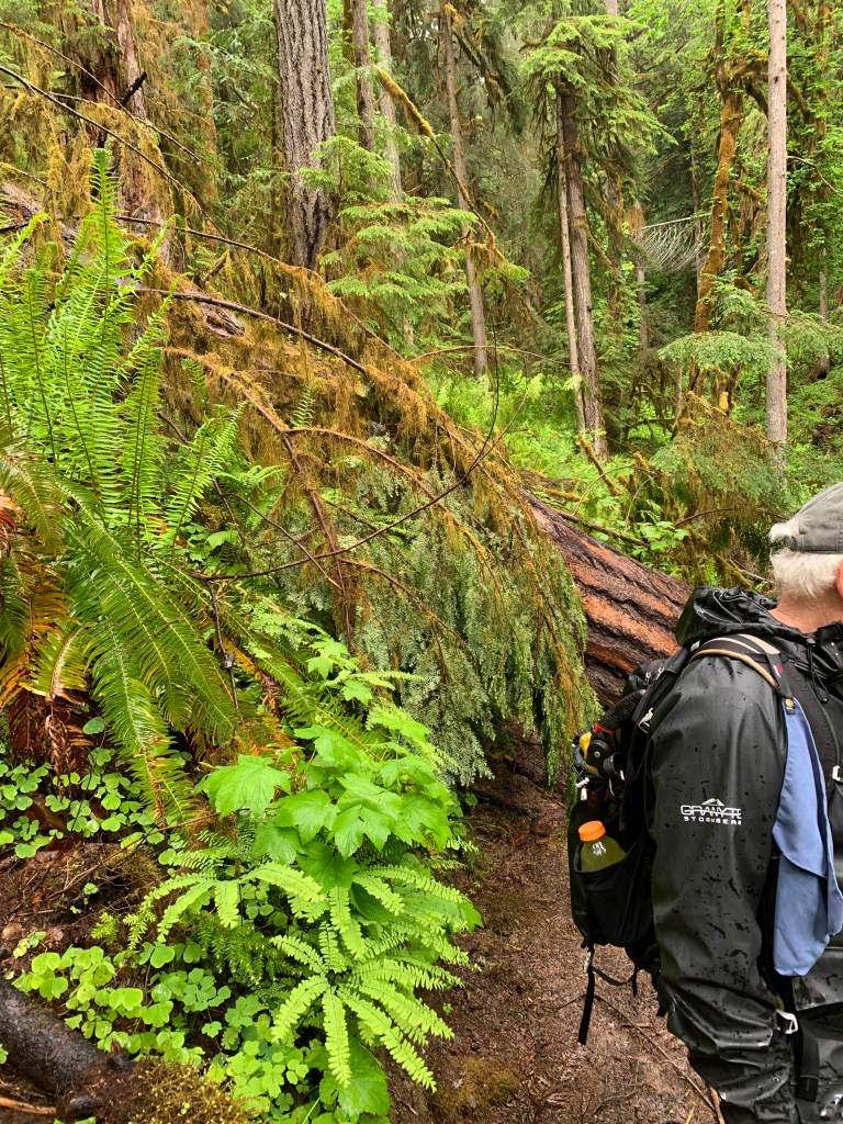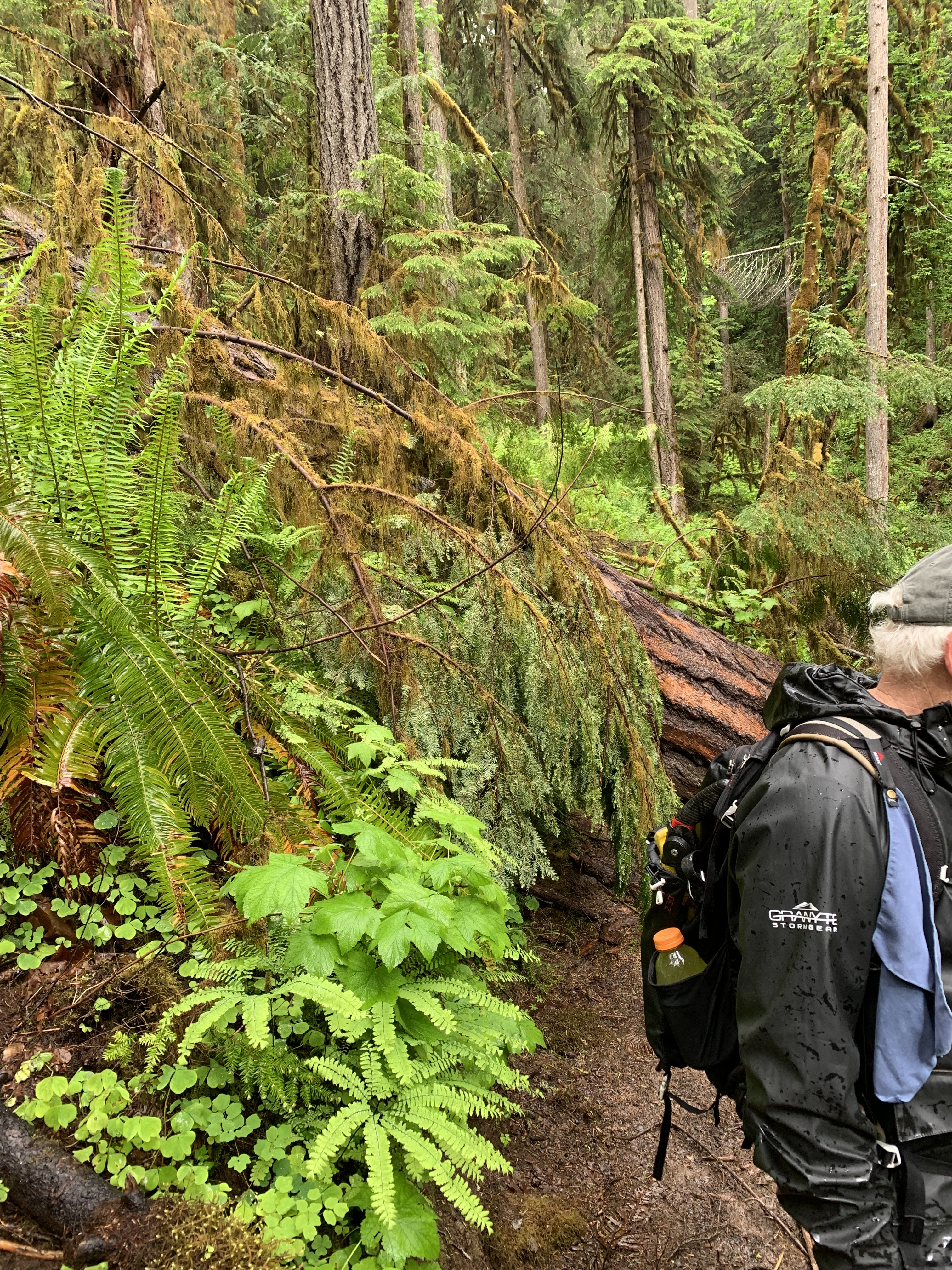 In other words, I was over confident and somewhat underprepared. I wore jeans under my suboptimal rain pants, because I work in trail jeans. I never hike in them. My rain jacket hadn’t been recently waterproofed; my rubberized gear for work is waterproof. I wore a hat, not a hard hat, and I had one trekking pole, not two, even though I wasn’t carrying anything. I just plain forgot to put on my gaiters and knee pads, although they were in the trunk of my car. The gaiters would keep my feet dry when I plowed through streams. I forgot my hearing aids that morning, although given the rain, that was a smart move. Even a monkey eventually hits the right key.  I did wear my heavy boots, although I wanted to keep them dry, because I had a saw certification test the next day, and I would need all my working gear dry and in order.  When I left Eugene, it was cloudy. Ten miles later, it was raining. The rain subsided for a while, but maybe a half mile into the hike it started to rain significantly.  A lot.