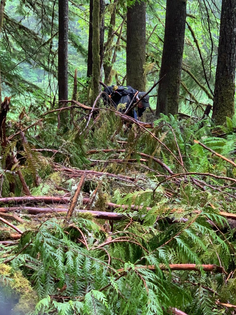 It took us only two hours to complete the hike. The brush was dense and wet, and I was first to pass through it.  When we finished, we loaded our gear and our wet selves in my car and I drove up Goodman Creek Road to return my partner to his truck. I stayed until I heard it start, then I drove back down and home, both front seats wet. I wasn’t going out that day to look at FS 24. I was wet, not cold, but not in the right condition to do road clearing, either.  It took my jeans two days to dry inside in Oregon humidity.