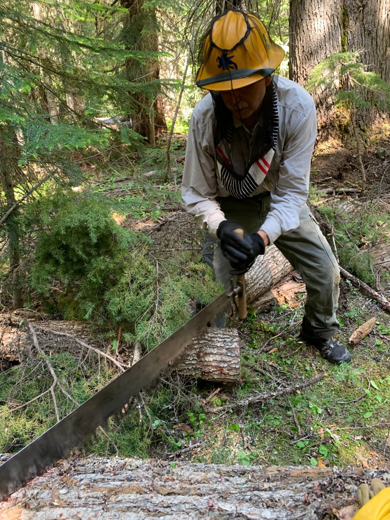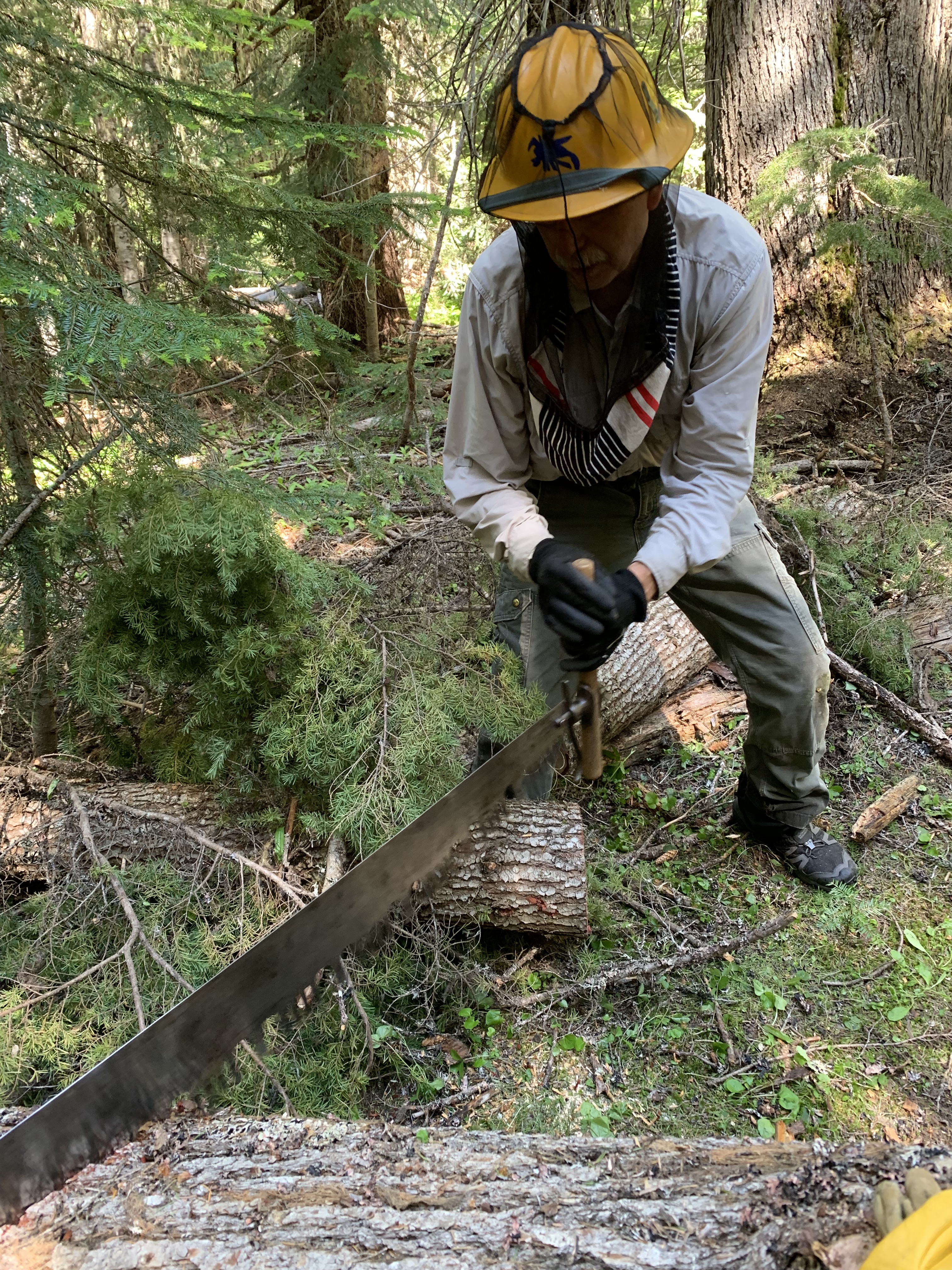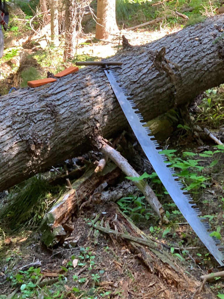 Further up the trail, I saw the two who had leapfrogged me looking a pair of logs, one about 12 inches, the other twice as much. As I approached, one asked how my face was, since he was using a bug netting. I was doing fine. He was having trouble adjusting his netting; it’s hard to wear under a hardhat or even over a hard hat. He and I cut out the smaller log and then the three of us took turns with the larger log, a nice one, where I could stand, take long slow strokes, and rock back and forth, almost like a dance.