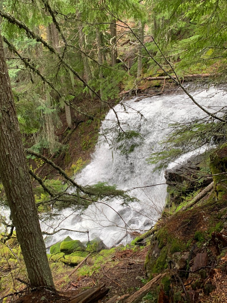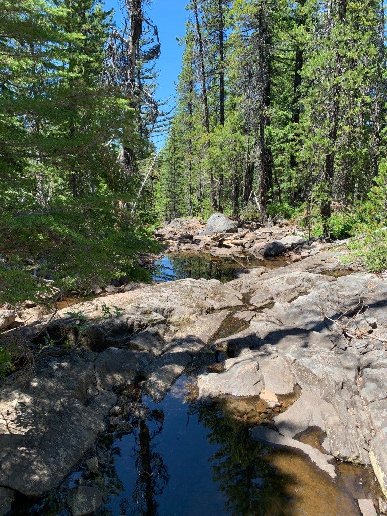 It was buggy, about as buggy as I’ve seen in Oregon, but I was the only one not wearing bug netting. I’m lucky; I don’t react badly to mosquito bites, and I figured—correctly, as it turned out—that once I started working, it wouldn’t be too bad. We got on the heavily shaded trail, fairly flat, which crosses the Skookum River entering the The Three Sisters wilderness.