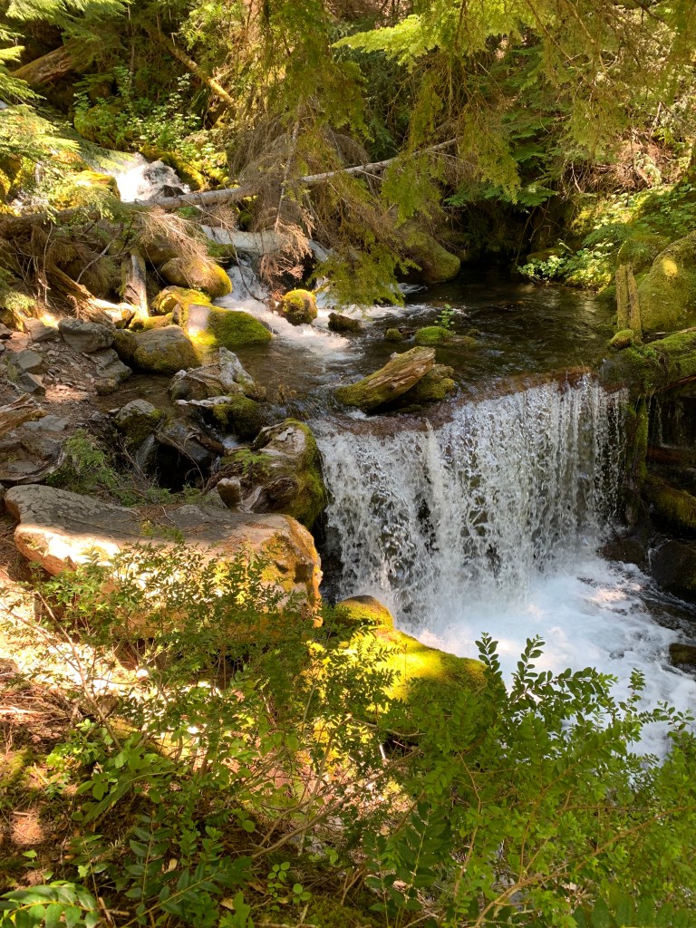 On 30 June, the Crew worked Black Creek Trail, which traverses 3.7 miles from the trailhead at the end of FS 24 to Waldo Lake, climbing about 2100 feet. A little more than a mile in is step-cascading Lillian Falls, after which the trail climbs steeply and steadily. We had logged out the lower 2.3 miles of trail; prior scouting by one of the Crew said there were no more logs until there was a wall of snow up at Klovdahl Creek, a mile from the end. We would have to wait for the snow to melt to do more, and in the meantime we tackled other projects.