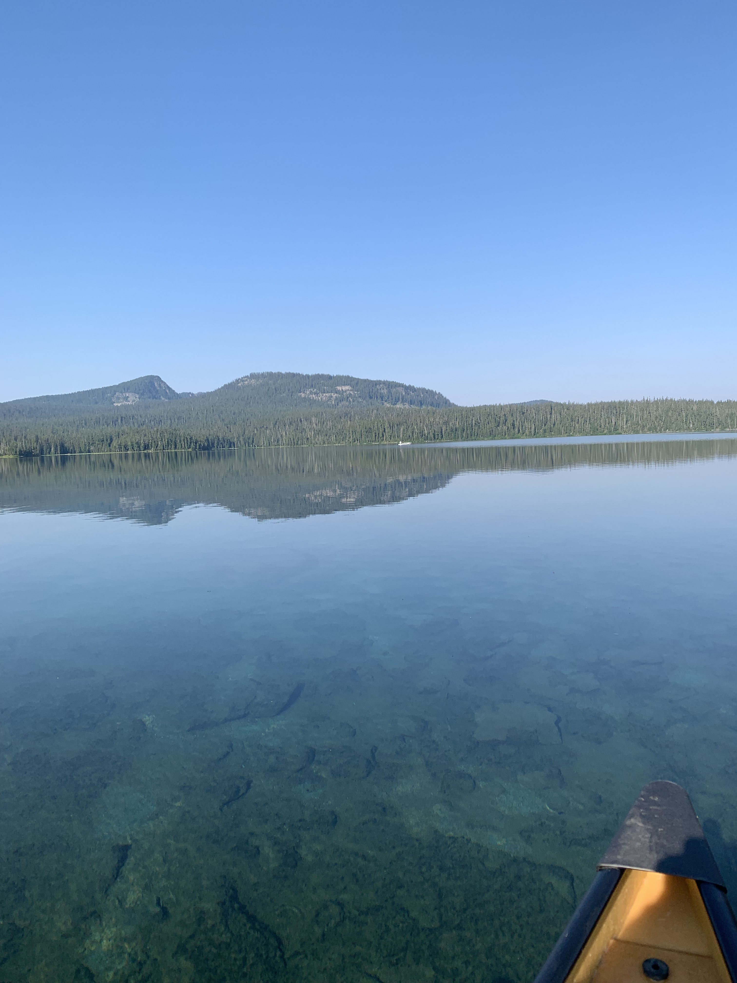 But canoeing on Waldo Lake? Wow! I emphatically agreed, and at 8:15 last Monday, we were at Shadow Bay with a We-No-Nah Heron canoe and our gear. I additionally had my paddle and rubber boots. It was incredibly buggy, as only Waldo Lake can be in summer, and this being my ninth summer here, I can say that Oregon finally approached Minnesota for bug issues. The NW Territories and Alaska are in a higher league with bugs, just the way they are with wilderness.