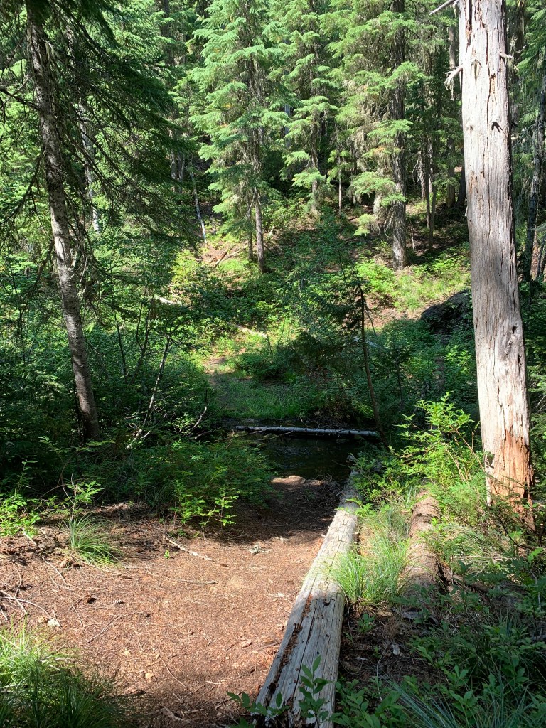 Within 100 yards, we found our first blowdown, and for the next mile there were at least a dozen more. I was able to chunk out a rotten one with a Pulaski to open up the trail, I pulled another two logs off trail, used Sig’s KatanaBoy 650mm on two more, and both of us used the 5 foot saw for the others. It was going to be 102 in the valley, and at 5400’ that translates to mid-80s. We wanted to get done in the morning if we could, and we did just that. We reached Klovdahl Creek at 1130, nearly six hundred vertical feet below where we started. We didn’t have to hike to where we had cleared from the other side, because we knew there were no logs. The wall of snow was history.