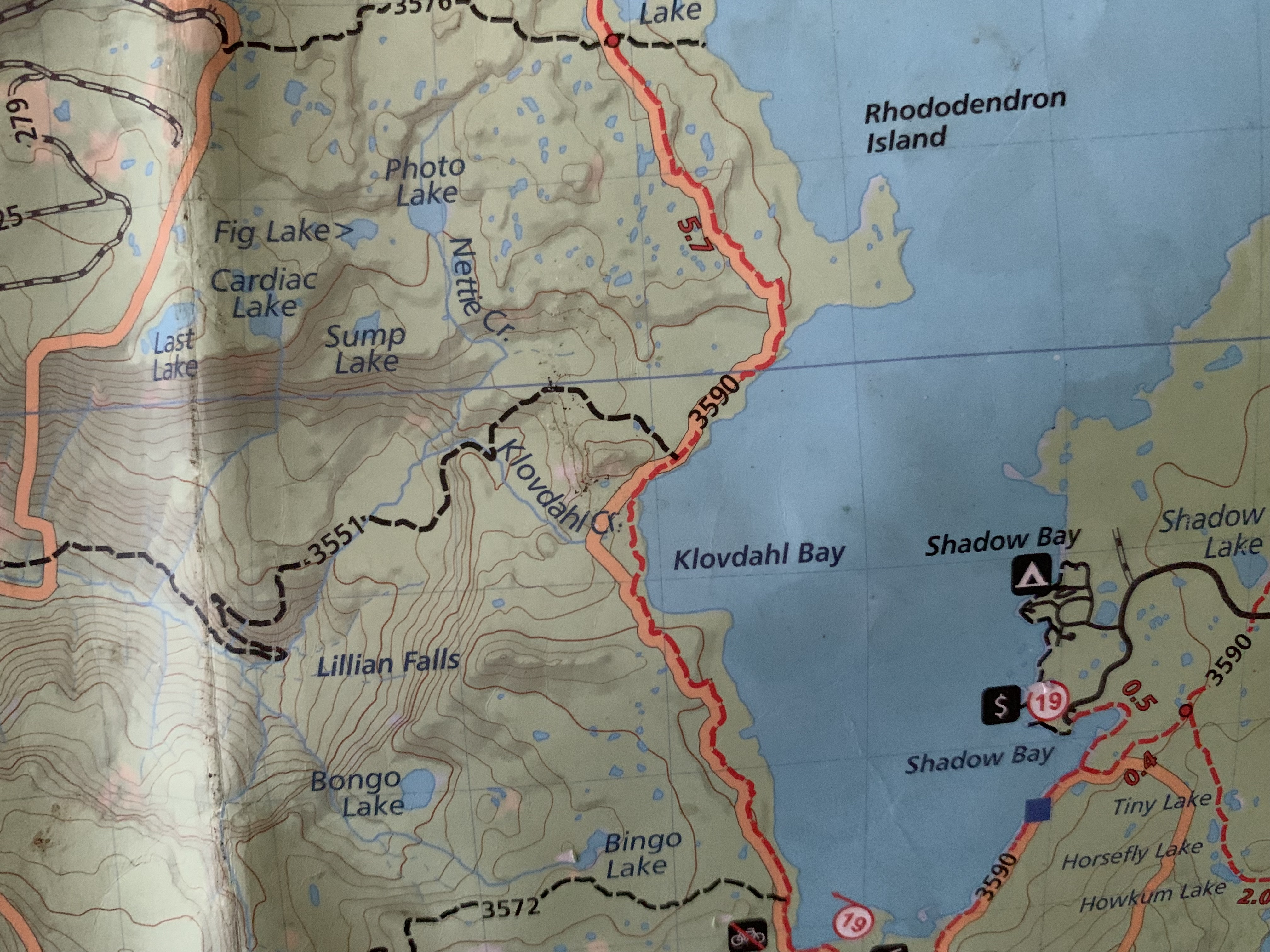 There were two obvious options to finish the last mile of the trail: one was to hike back in from FS 24 to finish the trail, which meant carrying the tools nearly three miles uphill before using them. A second option was to go to Shadow Bay on Waldo Lake and hike around the lake 4 miles on the Jim Weaver Trail that circles the lake to the other end of the trail, attacking it there.
