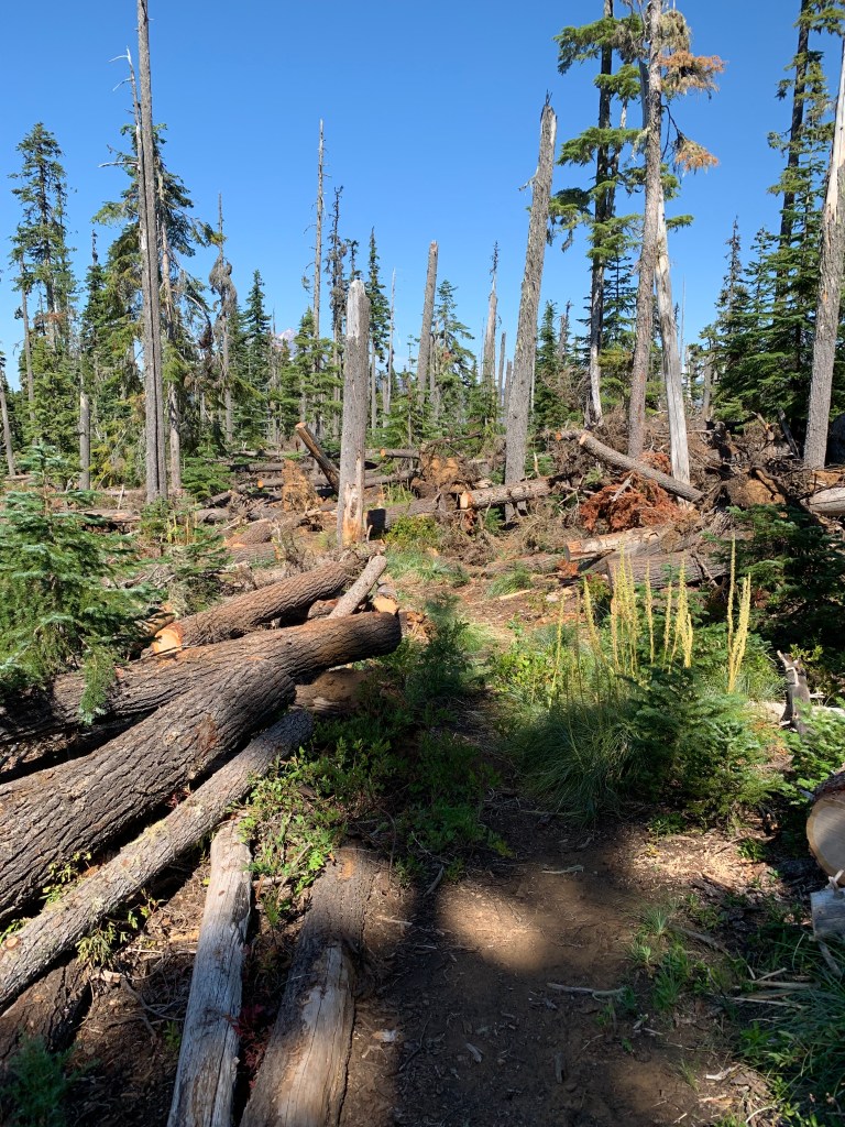 After lunch at Twin Lakes, we worked over a mile up the Lava Lake Trail the next hour until I caught up to my group and said that I was just plain tired. It was hot, we had cut out many logs, and I did not like each step carrying me further from the trailhead. To my surprise, the others agreed, so I radioed Beth and said we were turning around.  Within 20 minutes, all of us had turned around, including the group that got to the top of the Butte, where there are splendid views of Three-Fingered Jack and Mt. Jefferson. We heard, “It must be 450 degrees up here.”