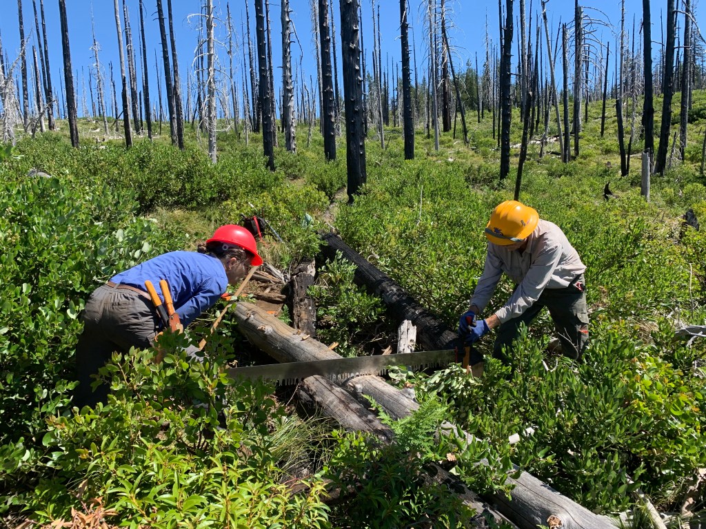 Two years ago, we began a joint annual project with the Salamanders, a crew out of Salem, where we had four crews, two crosscut and two chain saw, go in opposite directions; the latter’s cutting out logs outside the wilderness and the crosscut teams hiking to the wilderness boundary to start clearing. We finished clearing 7 miles in about 5 hours.