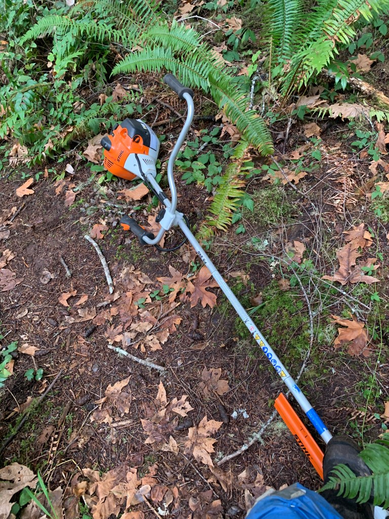 When it was my turn on the 25 cc Stihl brusher. I put on my yellow hard hat with ear muffs attached. I like brushing; I have reached a point where I can troubleshoot the beast. It starts for me right away (that would be fewer than five pulls) even having been stashed in the rain for a week. I went ahead cutting low to the ground, swinging the brusher back and forth across and the trail to the sides, and worked my way uphill for a third of a mile before a gradual descent.