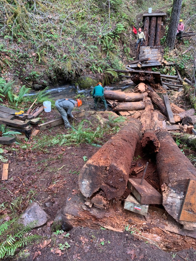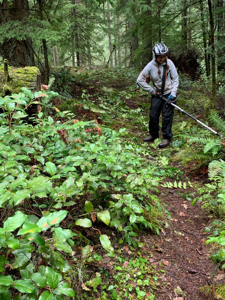 The Crew has worked a good share of the trail two years ago, logging it out, deconstructing three failed bridges, and filling in root wads. We hadn’t been back until now, and while the Traill had recently been logged out, it needed to be brushed. The forecast was for rain, which had started in Eugene, but the front had held up, and it was dark but dry at the trailhead. Good day for brushing.