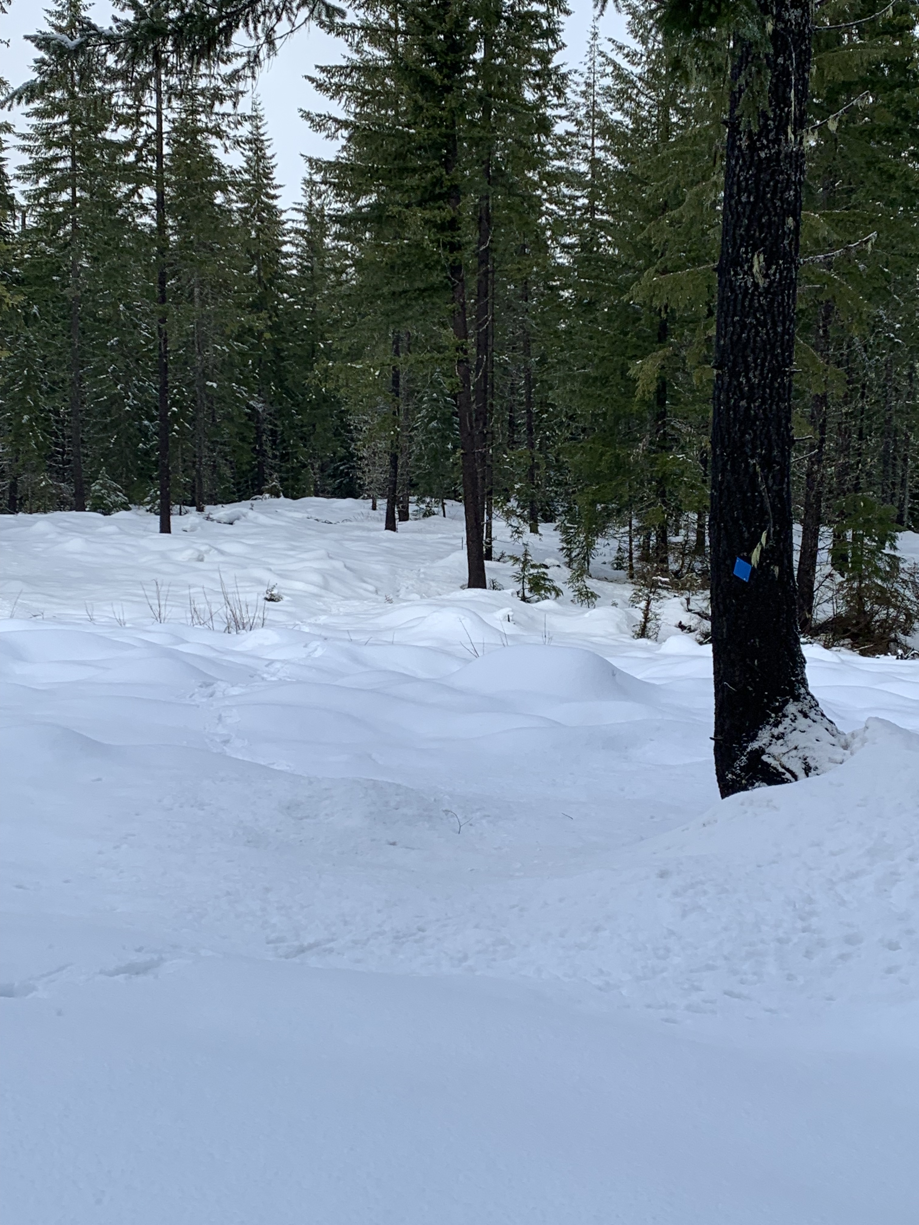 That winter, I went out with the diamonds, nails, and hammer from the other end of the loop, the Sno-Park parking end, found where the second meadow portion left a road, put up several diamonds and got two-thirds of the loop done before I ran out of diamonds and had to use orange ribbon to mark. I didn’t bother to go to the old trailhead. I had marked the trail with ribbon or diamonds, and more importantly, I now had it on my Gaia map on my GPS. I never got back there later in the winter, mostly because I was nursing some ailments from too much vigorous snowshoeing into other places.
