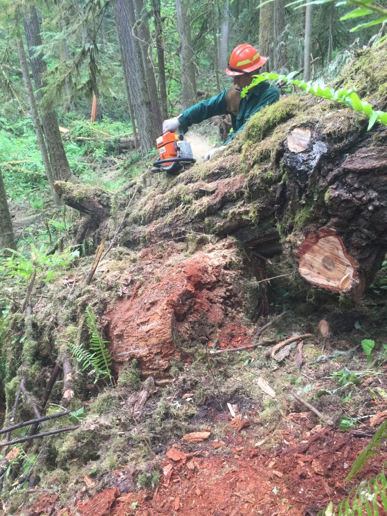 I have since been out there two additional times. It is dangerous work. I am seeing 2-3 ton logs under enough tension that when released, can fly upward 10-15 feet and a distance of 60 to 70. Clearing aa few of them can take a full day. We have to watch for logs above us which can roll down. Trying to walk through the mess on the trail is in some places impossible.