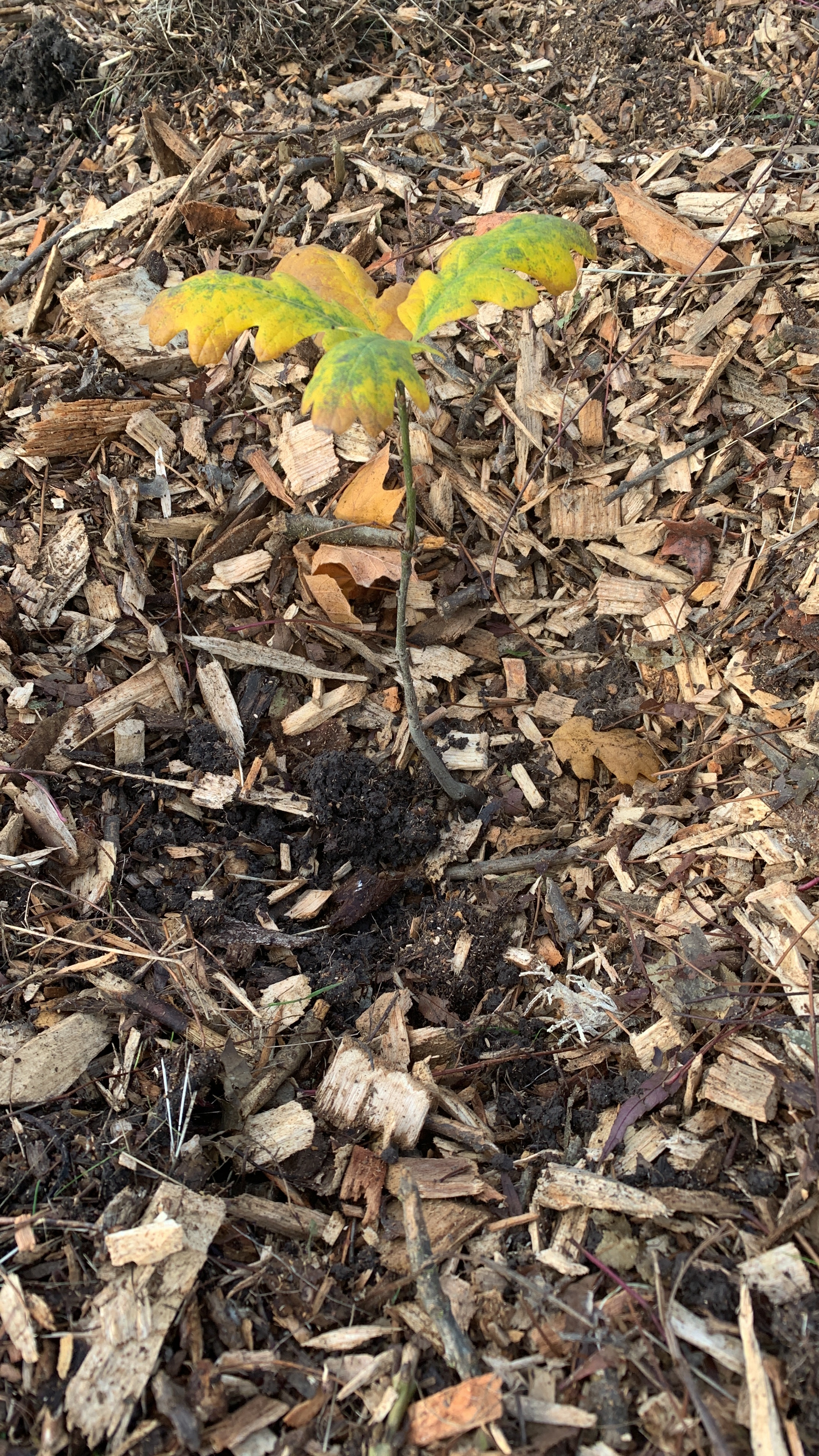 Two months later, I planted a white oak in Bethel Park. It had two leaves, each patchy green and yellow, but next year there will be several more. I thought about chlorophyll and took an intellectual adventure similar to the one I had last year when I studied tides, learning about the remarkable relationship among tides, gravity, and centripetal force, each inversely proportional to the radius cubed, squared, and first power, respectively.
