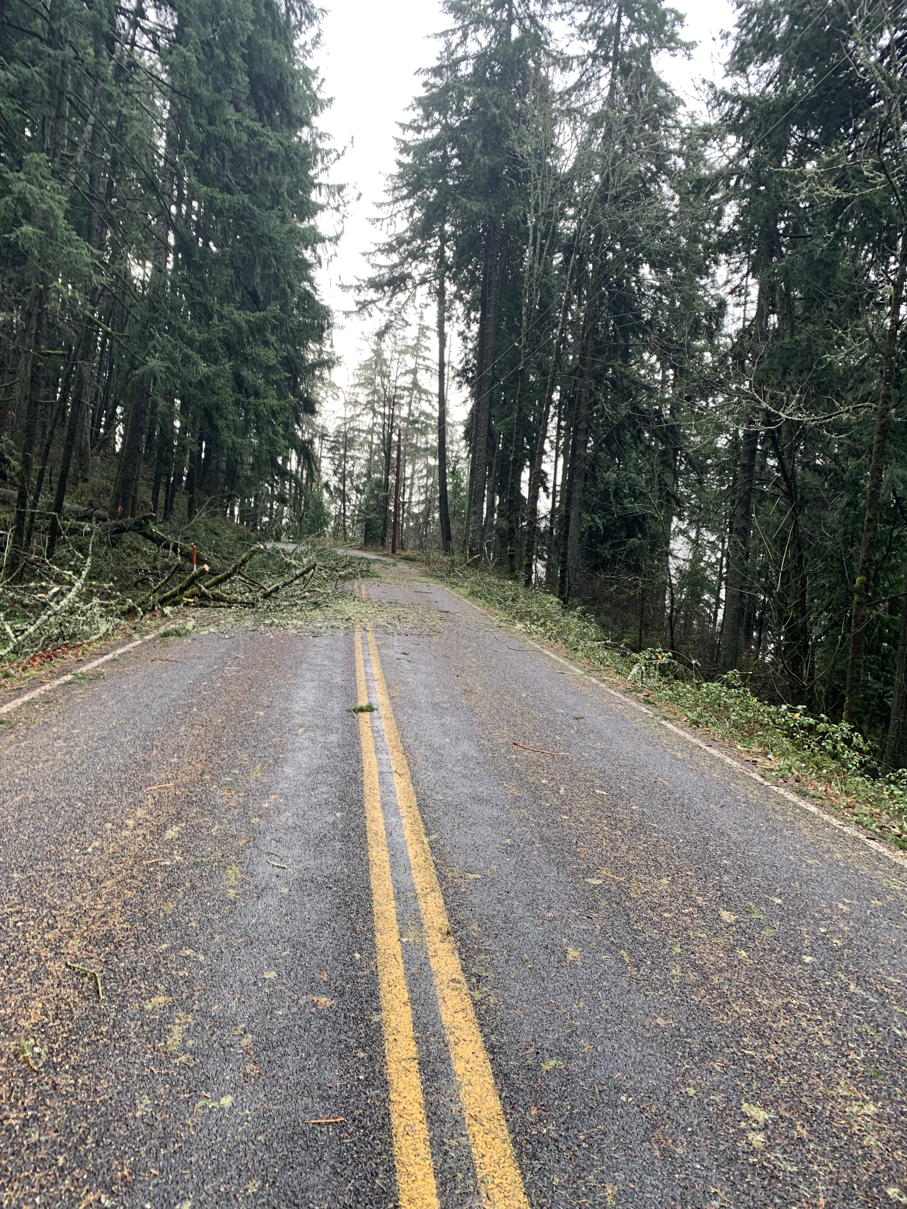 There were other before and after moments: puddle size before and after drainage work, the amount of water in the drains. Last weekend, when I scouted the trail, as I drove out from Lowell, the road was blocked with branches and small trees at mp 3.5. I joined two others to open up a lane, and we all went on. Today, the spot just had scattered green. After I left the upper trail, on my way back to the North Shore, there was now a tree angled over the road that I could fortunately drive under, not there earlier. It reminded me that a few years back, Jim drove past lower Fall Creek Road about ten minutes before a rock slide covered it.