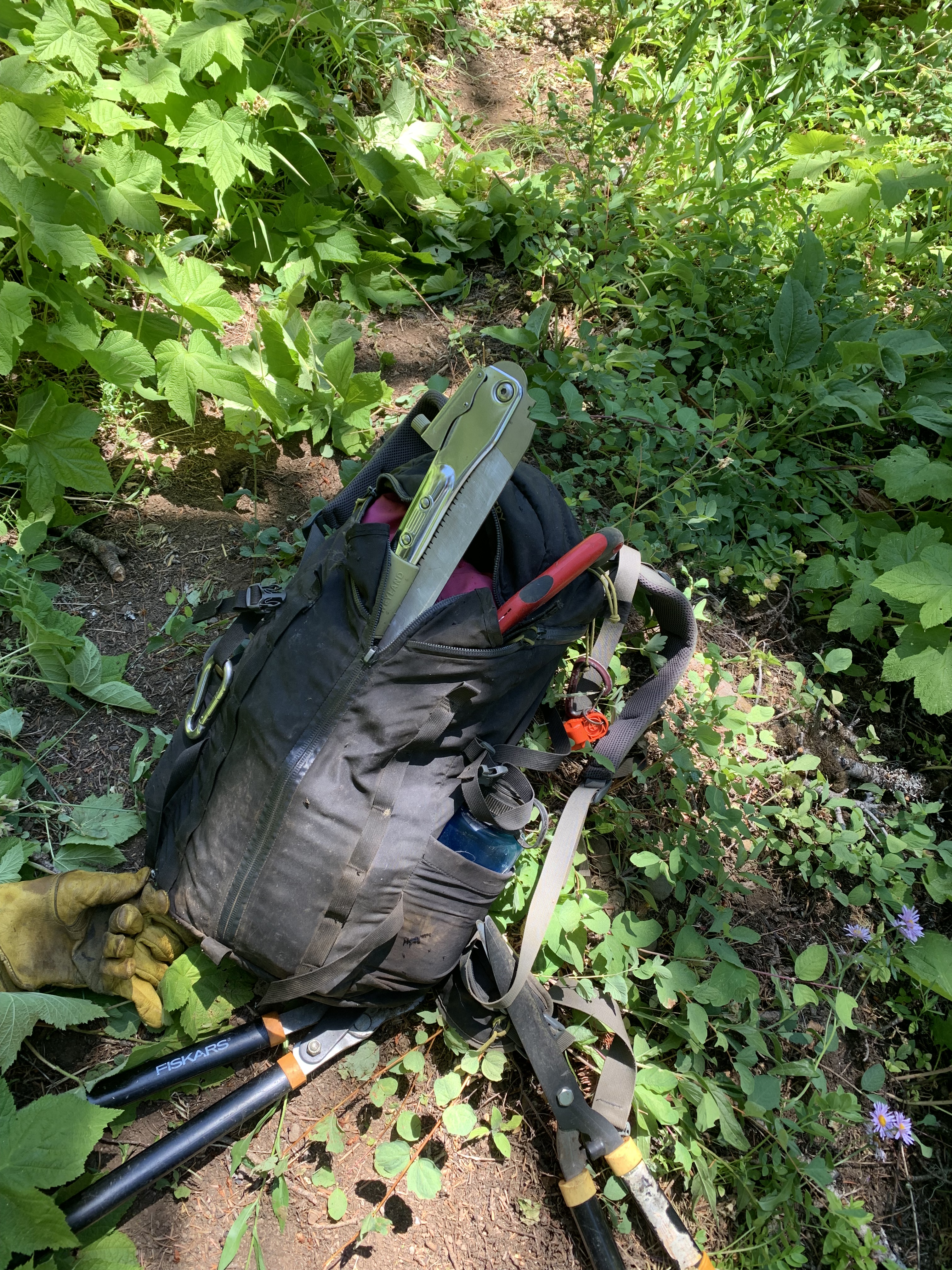 For the tenth time that day, we stop at a log to remove it from the trail. Each of us finds a spot to drop our pack, maybe before the log, because we want to get rid of the weight and bulk before clambering over the log, or perhaps after, so we don’t have to backtrack when we finish to get the pack. Placement sometimes requires later movement to prevent the cut log, a round, from running over it. Before dropping my pack, I need to put down what else I am carrying, usually an axe or a Pulaski, sometimes a large crosscut saw or a pry bar, then take off my gloves, unbuckle the hip belt and the chest strap, the latter often closer to my neck. Then I drop the pack directly through both arms or remove one arm strap and allow the pack to swing, whereupon I grab it, remove my other arm, then more gently lower the pack.