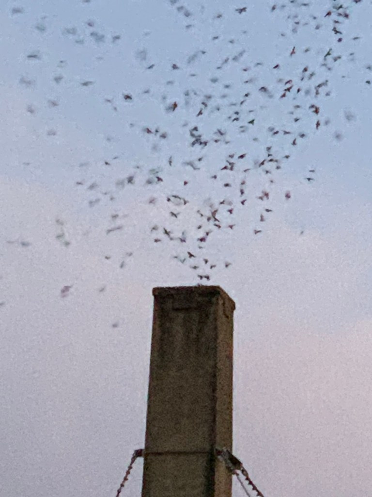 À propos to disappearing birds: recently, I went to see the semiannual Vaux Swift migration. This is my fourth year and wish I had started sooner. For several evenings, across the street from Hayward Field, home of Track and Field championships, Agate Hall, an old building with a defunct chimney, is a migratory stop for swifts. Twice a year, fall and spring, people gather for a chimney vigil. There was no guarantee anything would happen, in which case it still would have been a pleasant evening with a crescent Moon very low in the sky, as autumn evening crescents are. But this night the birds came, swirled and called out for 15-30 minutes in a huge circle high in the sky. Then, like the bottom of a celestial funnel, entered the chimney, black drops rapidly flowing into a container. Some birds didn’t get it right or for some reason only a swift knows, and did a go around. Within several minutes, nearly all the swifts were in the chimney. Their disappearing into a true Airdnb (dinner and bed) was the why we were all there. There were probably one to two thousand, but I’ve been there when nearly nine thousand entered. The migration is easy to see, fascinating, and describes exactly what writer Sam Cook said: “You don’t go out looking for cool things to happen, but you go out knowing cool things could happen any time. You have to be there.”