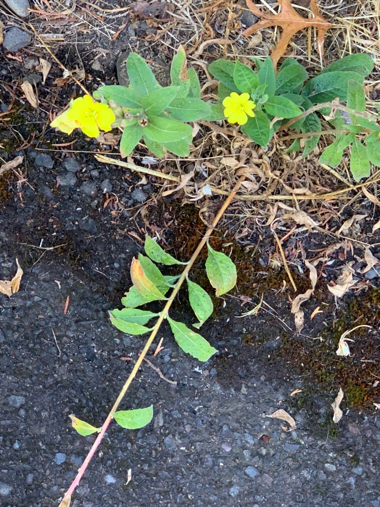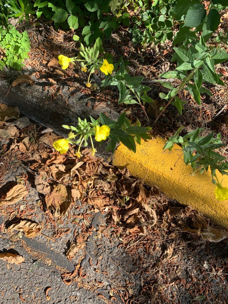 And stopped. I turned around. There was a yellow flower on a stalk, not a common mullein, because it had four petals; however, it was definitely, not a mustard. I smelled it but didn’t notice anything, although my nose was a little stuffy. I wasn’t totally sure what it was, but if I had to make a call, I would have said it was an evening primrose (Oenothera biennis.)