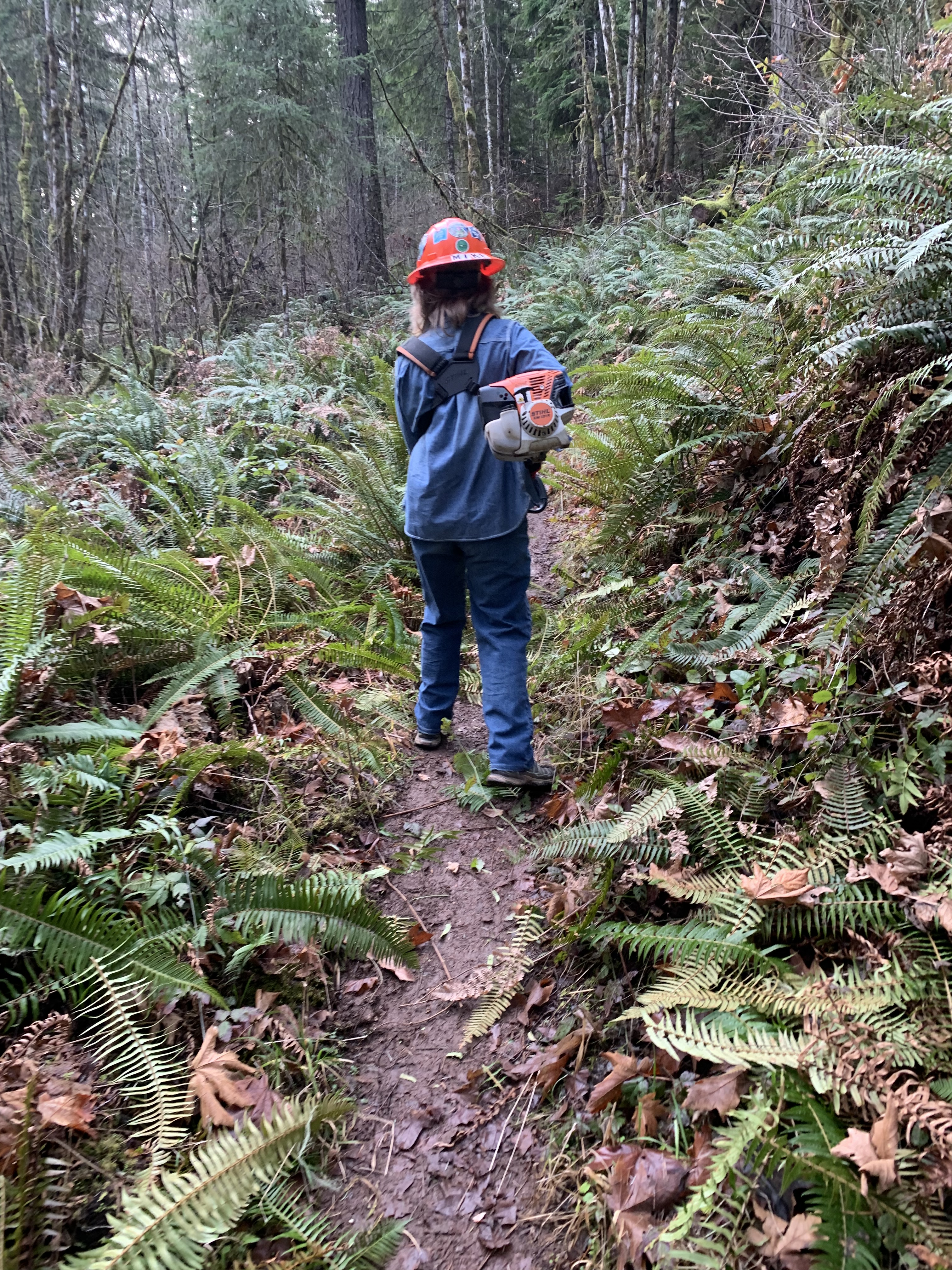 A half hour earlier, when I addressed the other 6 in the brushing crew at Crale Creek Rd., I was ready for this day. It was my eighth time on the South Willamette trail (SWT) this year. Two days earlier, I had brushed 0.7 miles of it with Caroline, another new person, competent with a brusher, willing to take a shortcut to the trail, even going by an illegally parked trailer with a couple of dogs. We got the trail brushed, and we had fun doing it.