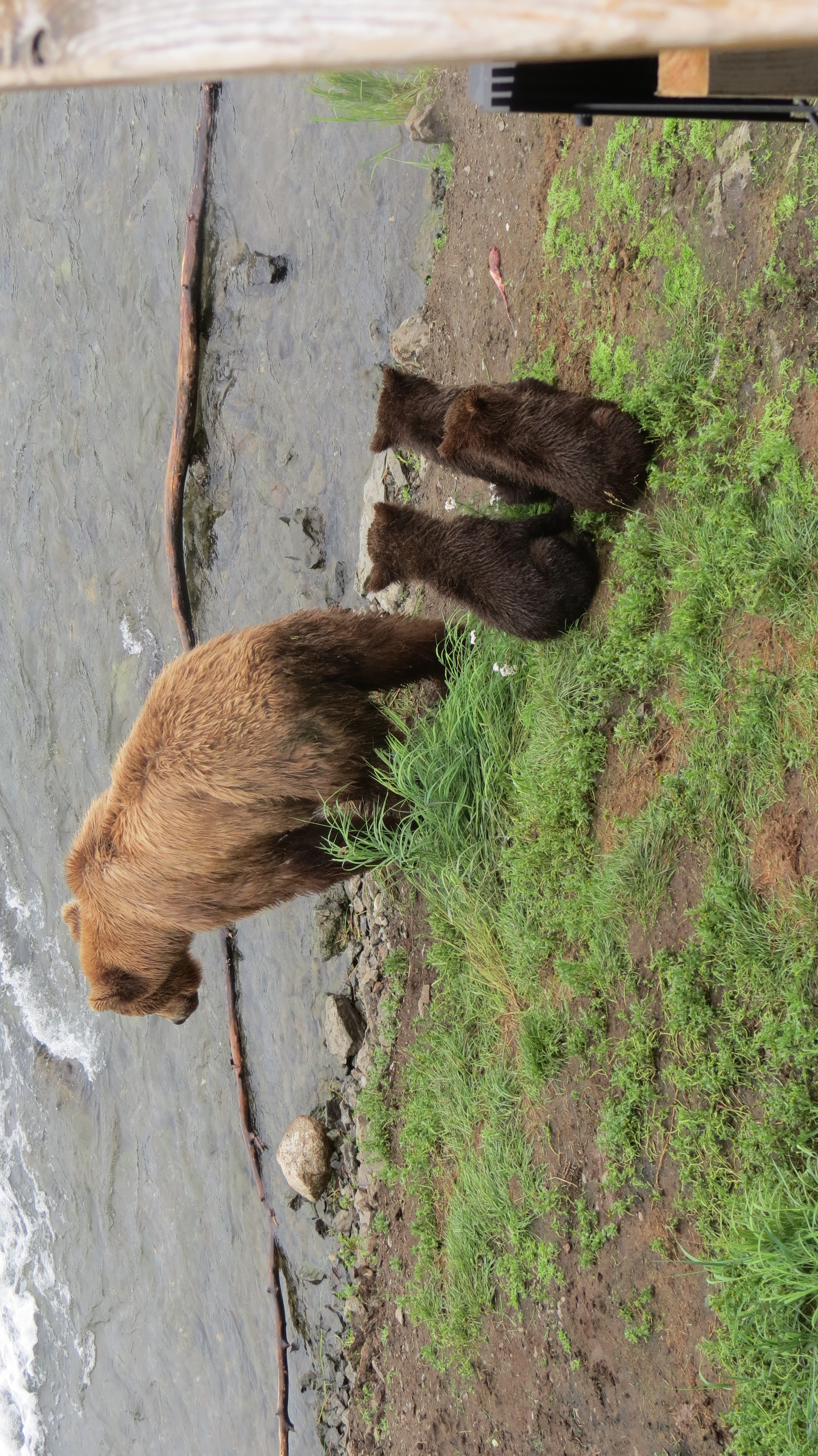 The three cubs did come down from the tree, Mom got them a salmon from upriver, and they disappeared into the woods. It is difficult to know how many will survive. There is a lot of food, but there is also a lot of predation. The spring cubs got a much later start, and it will be less easy for them.