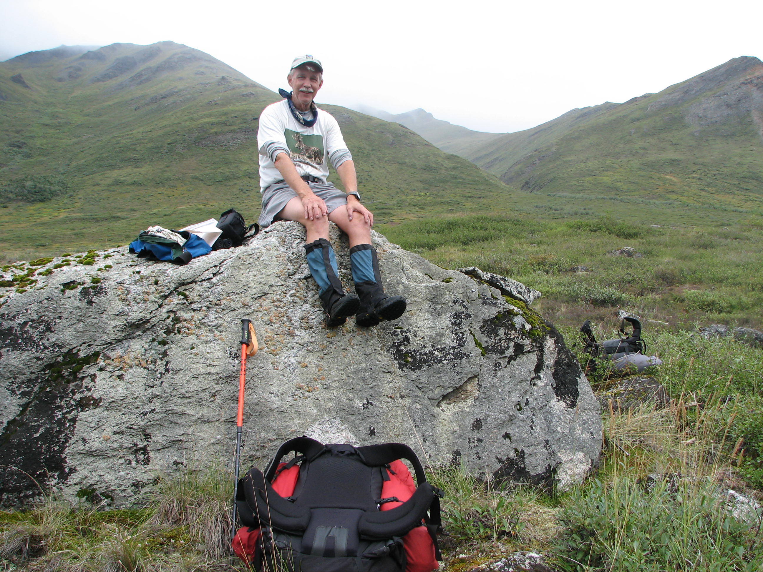 We landed on semi-flooded tundra and my boots were soaked for the next 11 days, temperatures most of the time hovering at freezing. I packed four pairs of wool socks, kept one pair for night, which meant after three days my dressing began with cold wet socks. It mostly rained or rain-plus— hail, graupel, or sleet. We crossed and recrossed the Aichilk, walking on ice by caribou, as we headed south into the Brooks Range. One day, we sat down on the tundra for lunch near the entry into the mountains and had caribou walk close enough to touch, between us and the river. That afternoon, we hiked underneath rock faces where Dall Sheep stared down from us from thirty feet up. I had a wolverine run right by my tent one morning and a caribou calf do the same one evening. The last day, in sunshine, we saw a griz rolling on ice and then hiked over a mountain rather than take a chance on a valley with a rain-swollen stream.
