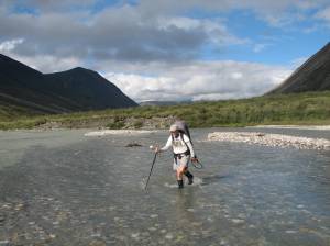 It was much later that I discovered Alaska. Oh, I did the Chilkoot Trail in ’84 and ’87, paddling the Yukon as far as Carmacks; I paddled the Nahanni in the Northwest Territory in between those two trips. I didn’t camp above the Arctic Circle until 20 years later. By then, I knew if I didn’t start to make my dreams come true, I never would. First on the list was the Arrigetch Peaks in the Gates, spending four nights at the base of the mountains, close enough to hike up and place the palm of my hand on the granite. We tried to get back into Aquarius Valley, but the rain made it too slick and unsafe to see the whole thing. We got to the glacier that is the headwaters of Arrigetch Creek. On the eight mile hike back to the Alatna River, there had been so much rain that we had to detour upstream a mile to finally cross in fast water that was mid-thigh in depth, then walk a mile back down to move forward a net ten yards.