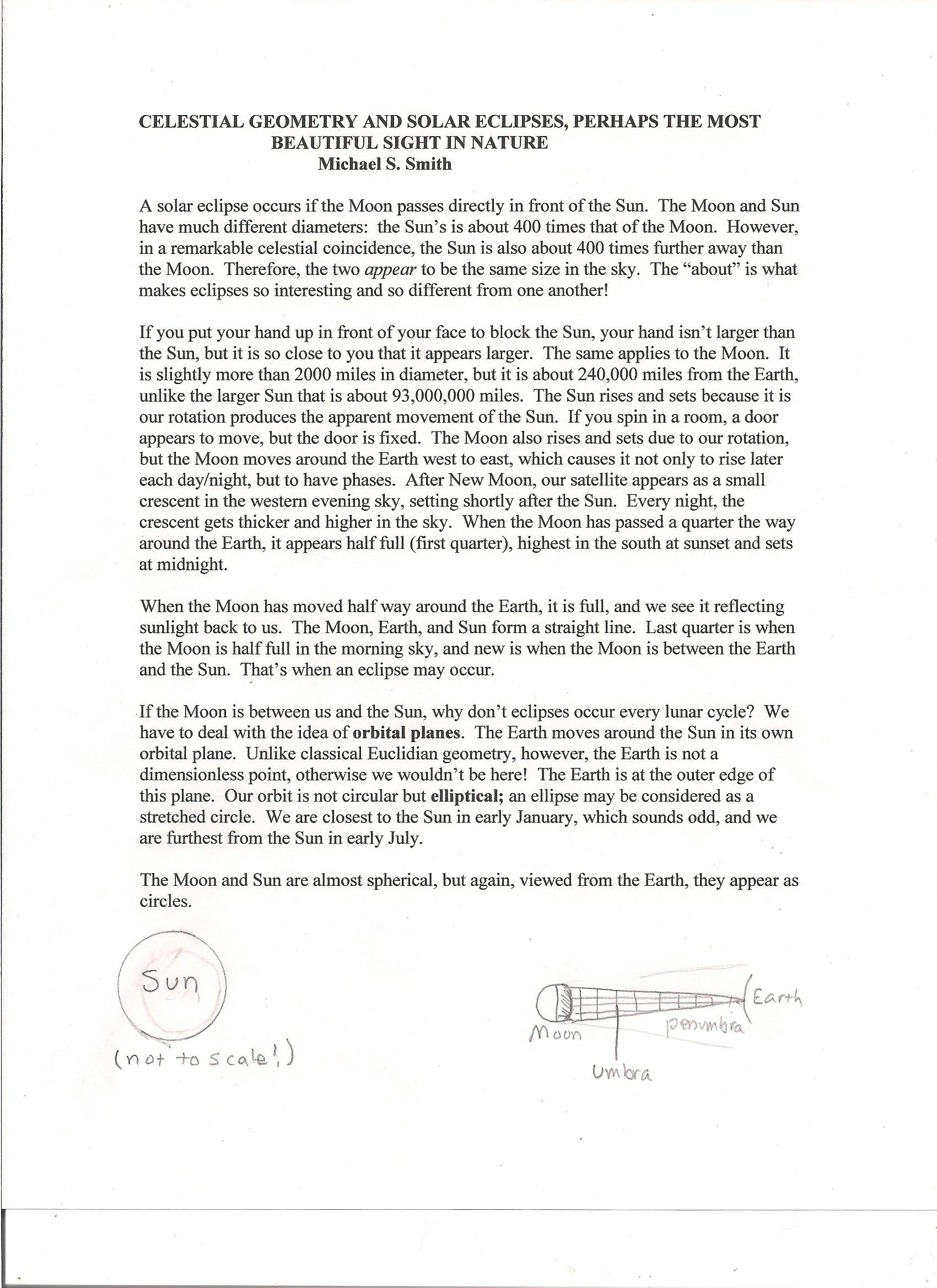 As totality approached, I kept waiting for the proverbial shoe to drop, or realistically, for clouds to appear, for the models had shown a huge difference in cloudiness between 1 and 2 p.m., and the eclipse occurred about 1:35. But cloudiness would not be a problem. We would see this. The young man had earlier asked me what he would see at totality. I had replied simply, “I’m not going to tell you. I want you to find out for yourself.” He did, after 4 minutes and 8 seconds.