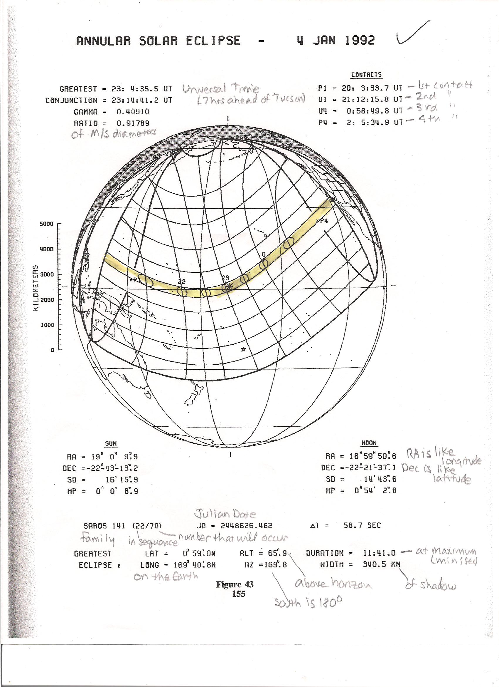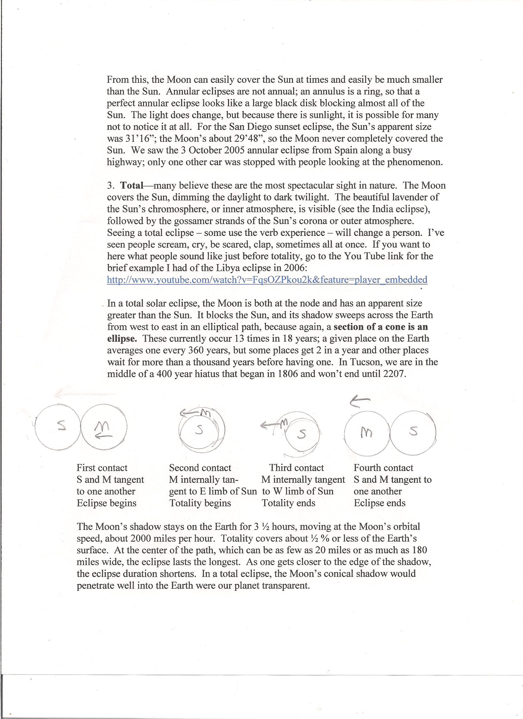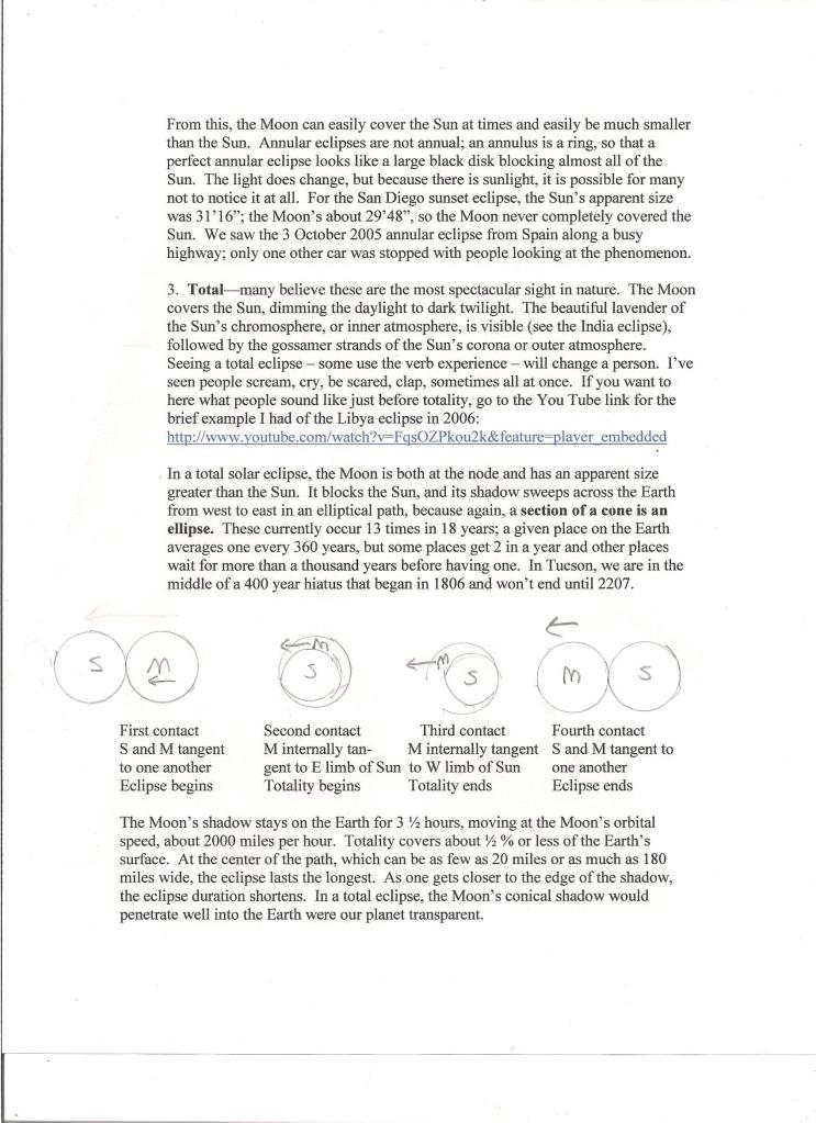 One family had a young man who wanted me to talk about eclipses, and so I did. He was so interested I gave him the “nerd talk,” about how the three major cycles of the Moon, the synodic, anomalistic (perigee to perigee), and draconic (node to node, or crossing the plane of the Earth’s orbit going north for example, to doing again) all come into exceptionally close alignment (5 hours) with 223 cycles of the first, 239 cycles of the second, and 242 cycles of the third. The alignment is every 18 years 10-11 1/3 days (depending upon leap years and time zones). Each member has a path similar to the previous and shifts a third of the way around the world to the west. I saw this same family in Libya 29 March 2006, and three cycles prior to this was the 7 March 1970 eclipse that went up the Eastern Seaboard, where I was outside the path of totality (and regret it every time I hear Carly Simon song, “You’re so Vain”). He was fascinated.