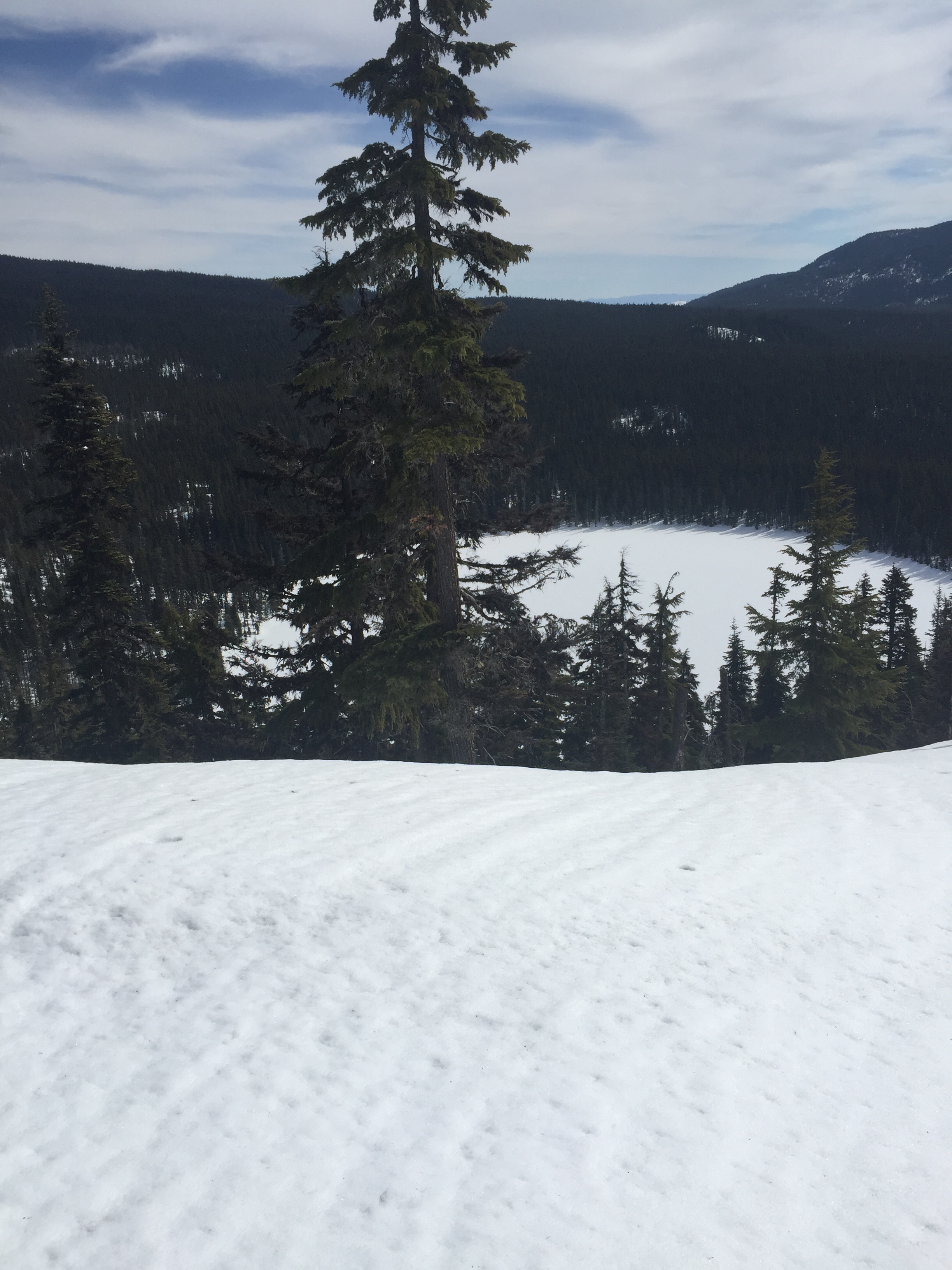 I hadn’t been on Tait’s this winter, but I remembered most of the trail well, and I knew the top part was a lot longer and more difficult than I gave it credit for. Eventually, I reached the junction at about 6300’ and turned south towards the viewpoint to Lower Rosary Lake, far below me. The Diamonds were in good position, and I didn’t have to fix each one, but if on one side of a tree a diamond was too low, the other side would be, too.