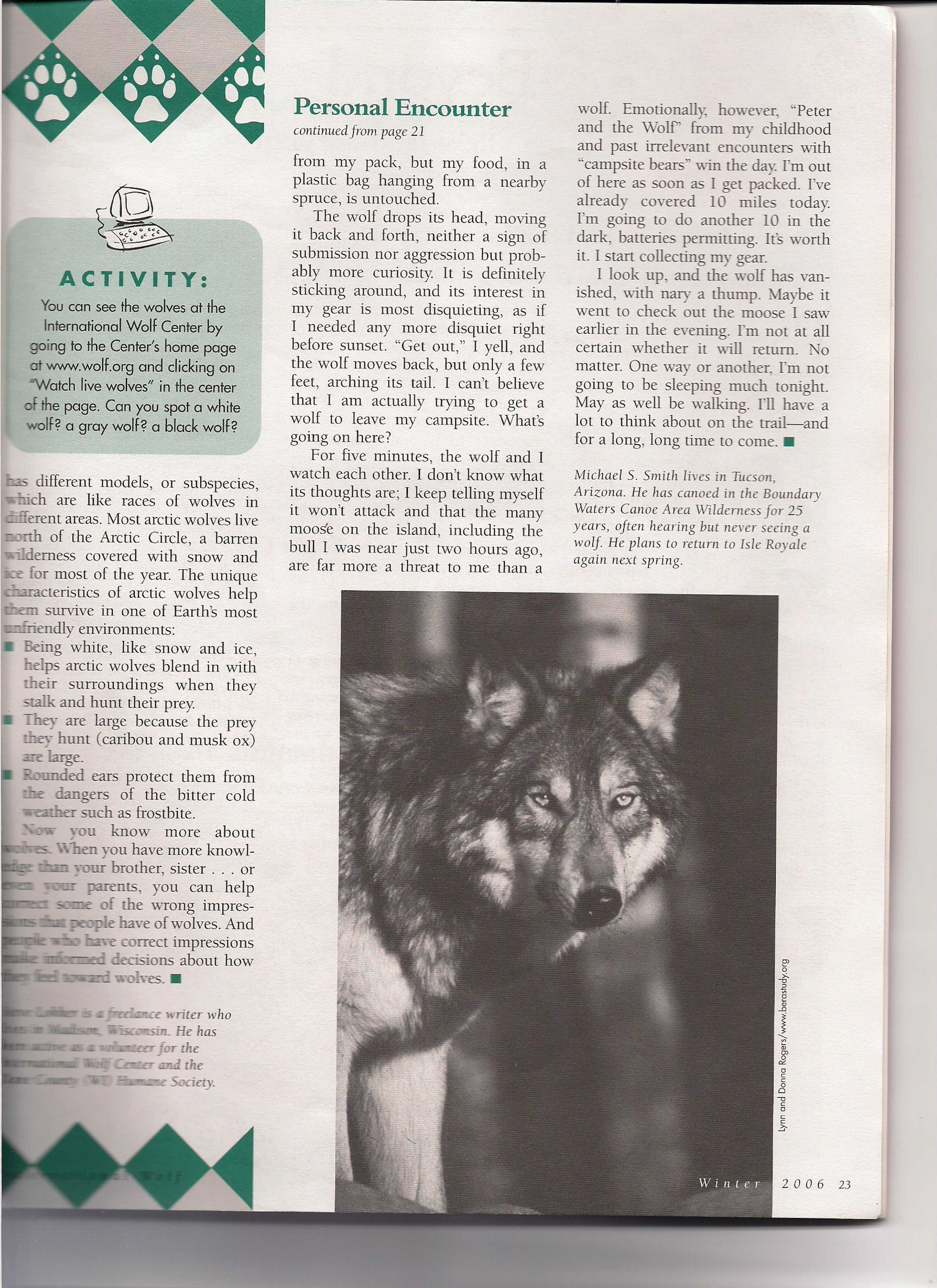I put on my shoes, opened the screen and looked in front of me. Nothing. I crawled out, stood up, and turned around. Twelve feet away, separated only by air, was an adult wolf.
