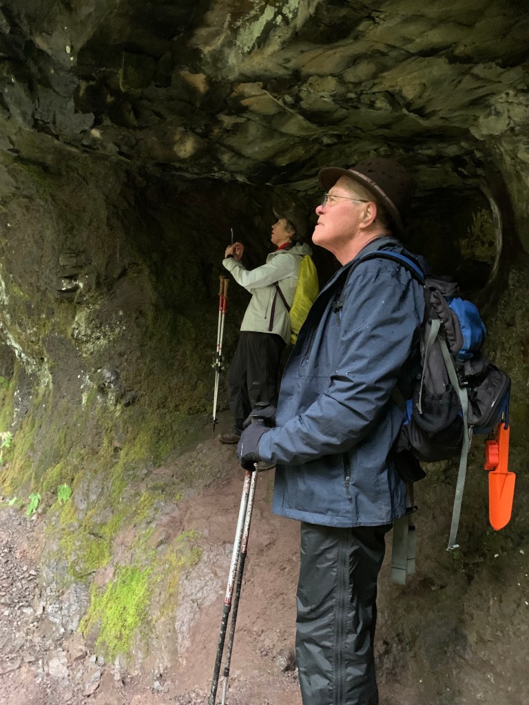 I thought my breathing wasn’t as bad as it could have been but did a rate check and disappointed to find it 51 per minute, what I have at the top of Spencer Butte. That was disconcerting, so I took a break just after a switchback near a root wad that Jean and I had worked on with a few others four years ago. She and Roy were right behind me. After they stopped, they began to loosen their rain pants, and then I noticed they didn’t continue to remove them, just tied them up a little bit to put them out of the way. I think they thought I was ready to keep hiking.