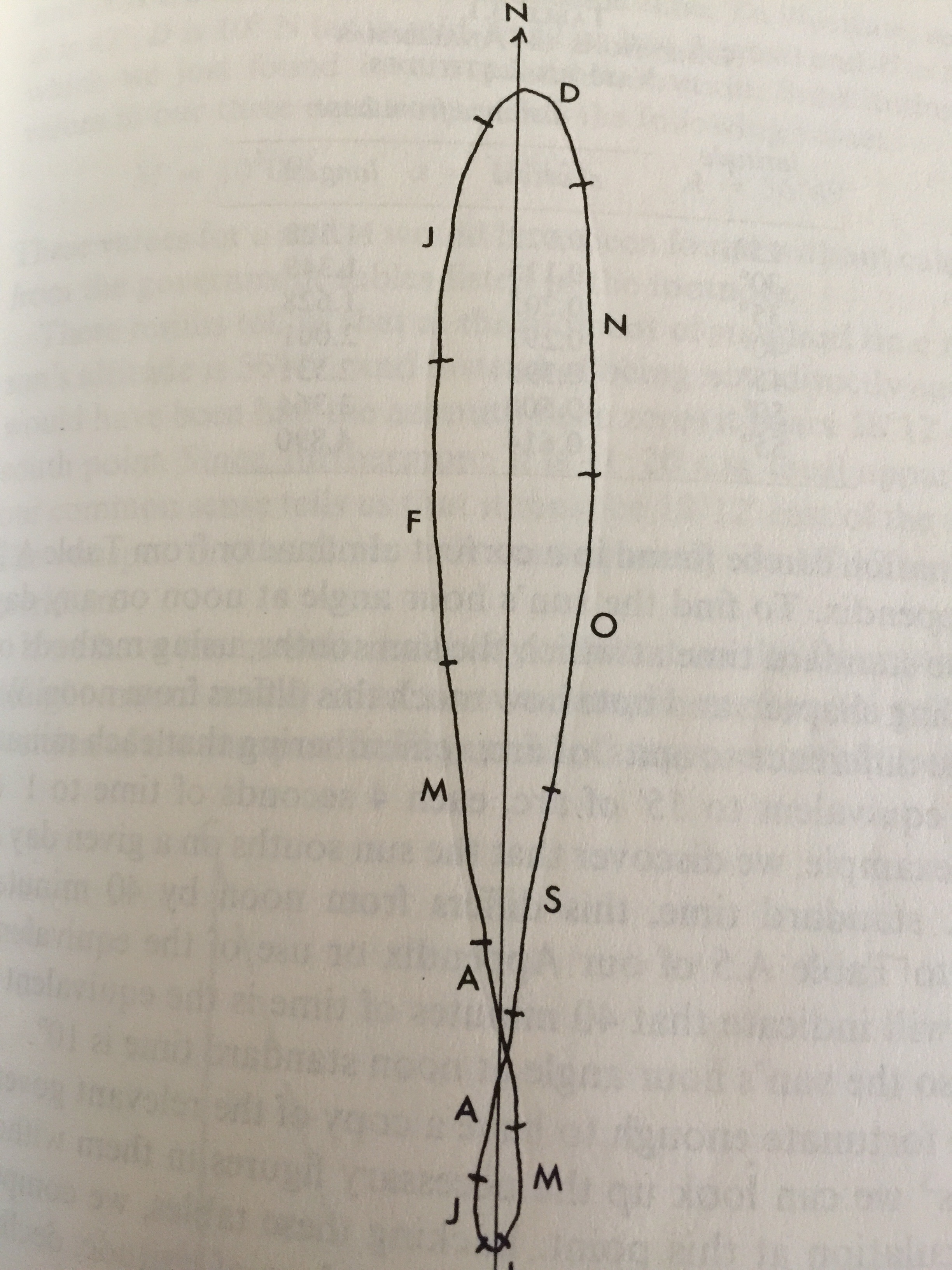 Analemma: The shadow caster is at the bottom, where the shortest shadow will be (summer in the Northern Hemisphere.) The areas to the right are where the Sun “runs fast” relative to clock time, especially in autumn, which gives rise to the very early sunsets we notice. In January and February, the Sun “runs slow,” and we see that as late sunrises but relatively late sunsets, too. We notice by Christmas that the Sun is setting later. The vertical line is neutral. Four times a year, Sun and clock time are the same.